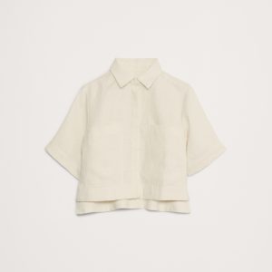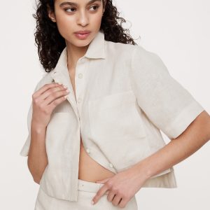 A little linen moment. This boxy top is cut from certified European flax linen with premium details: a covered button placket, chest pockets, and a high-low hem. Pair with the matching mini skirt or style with high-rise jeans.