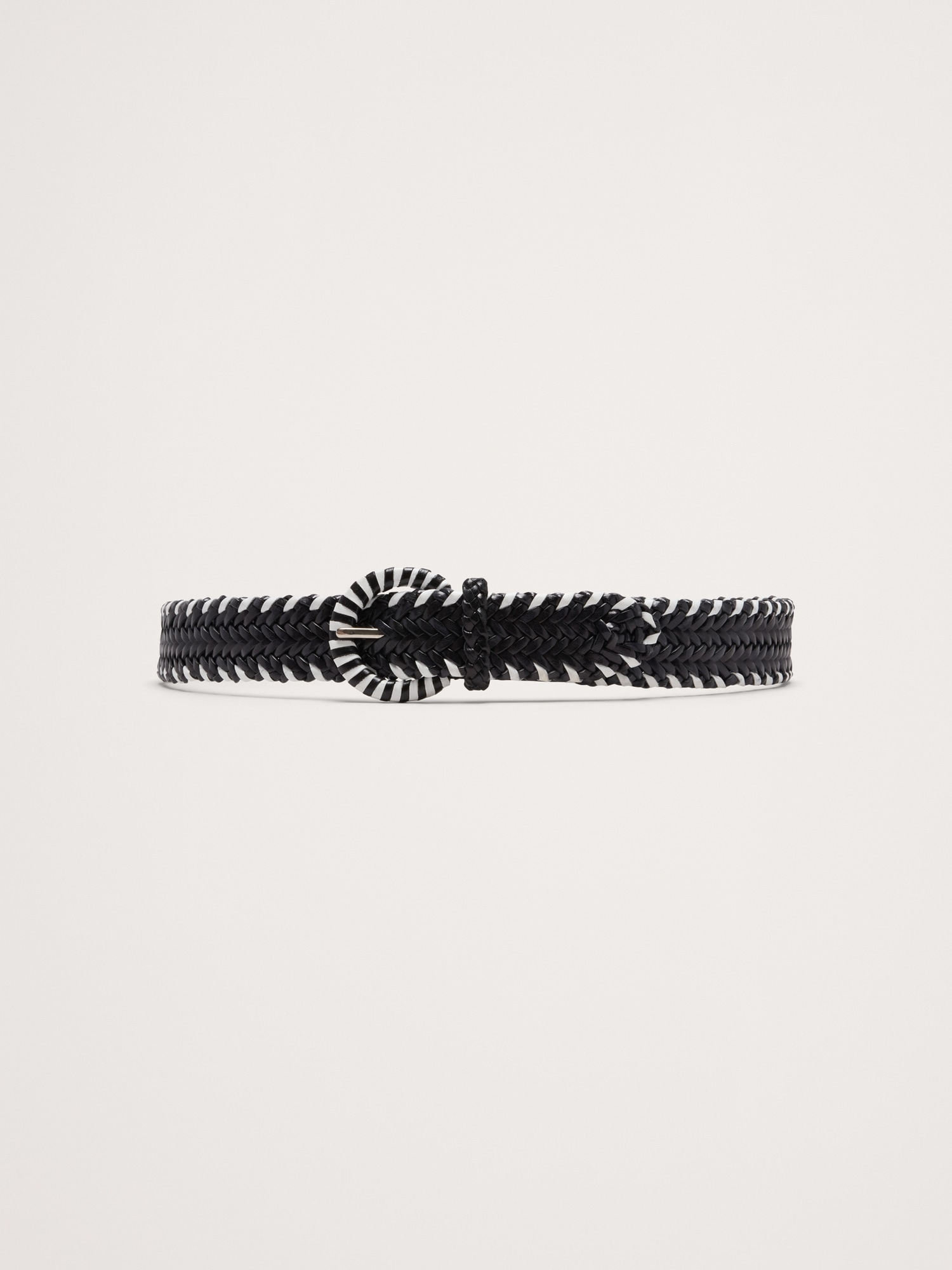 A classic braided leather belt with contrasting whipstitch leather accents and a wrapped leather buckle.