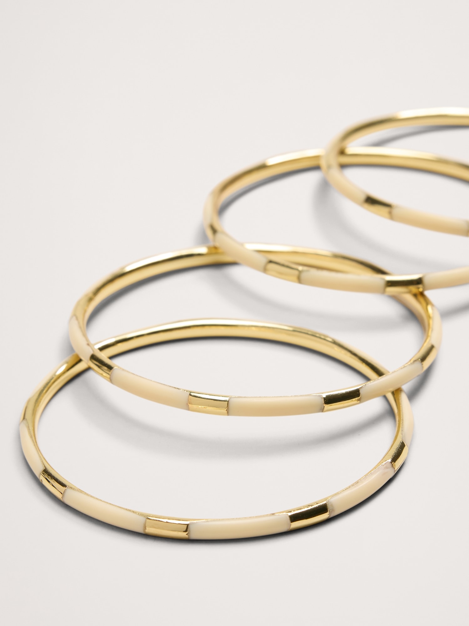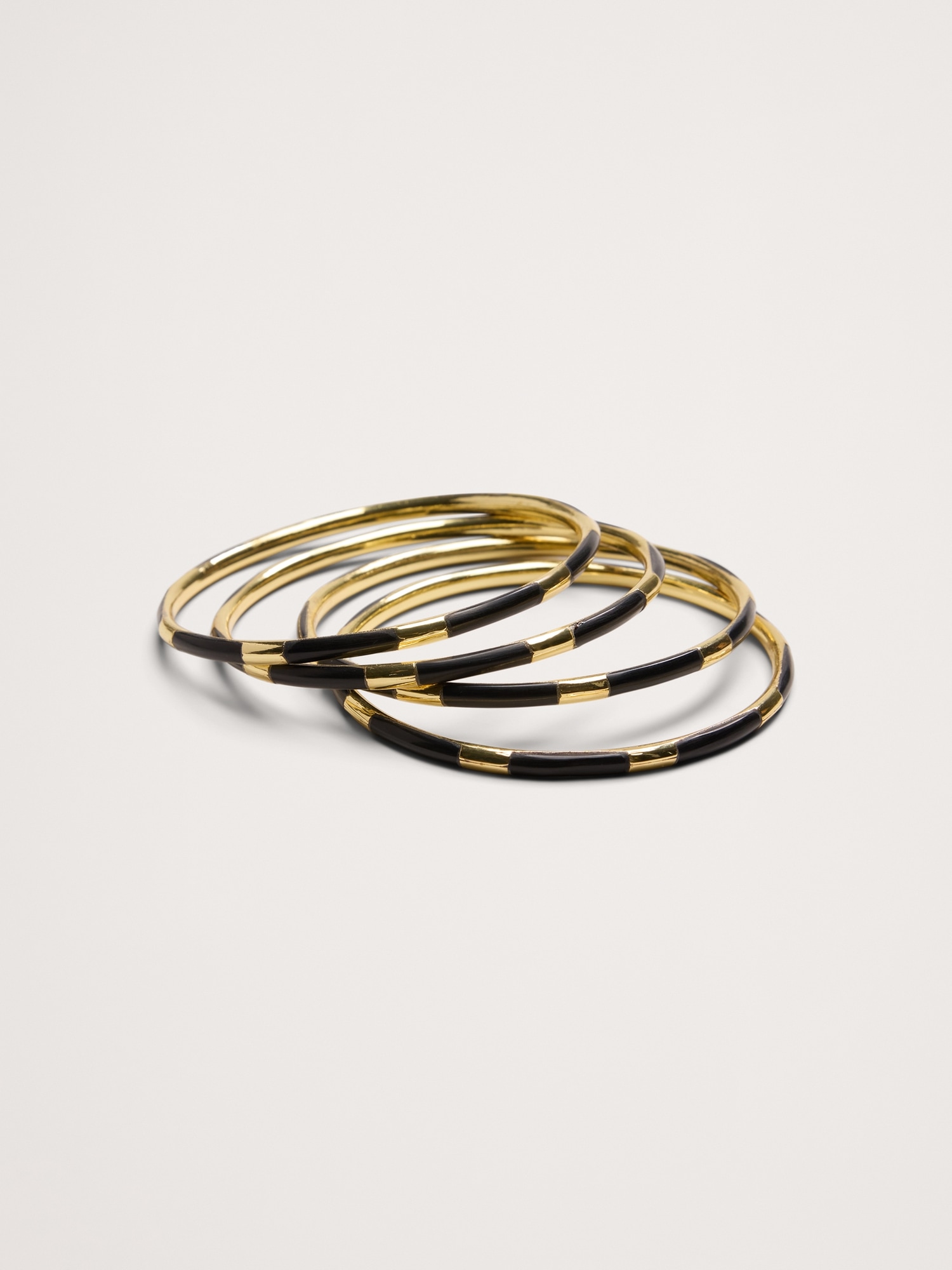 A versatile set of slender polished bangles pair smooth resin and high shine brass.