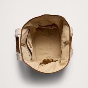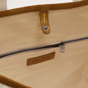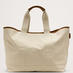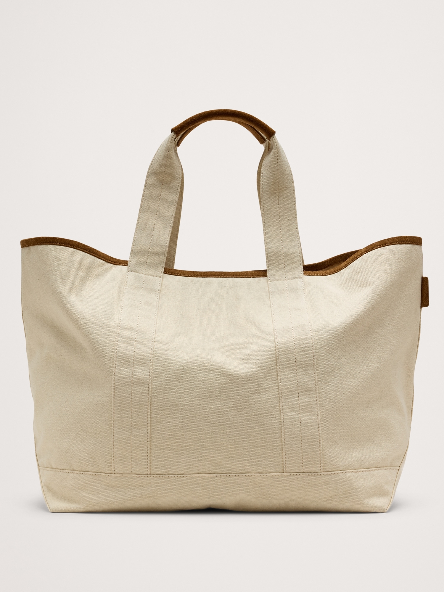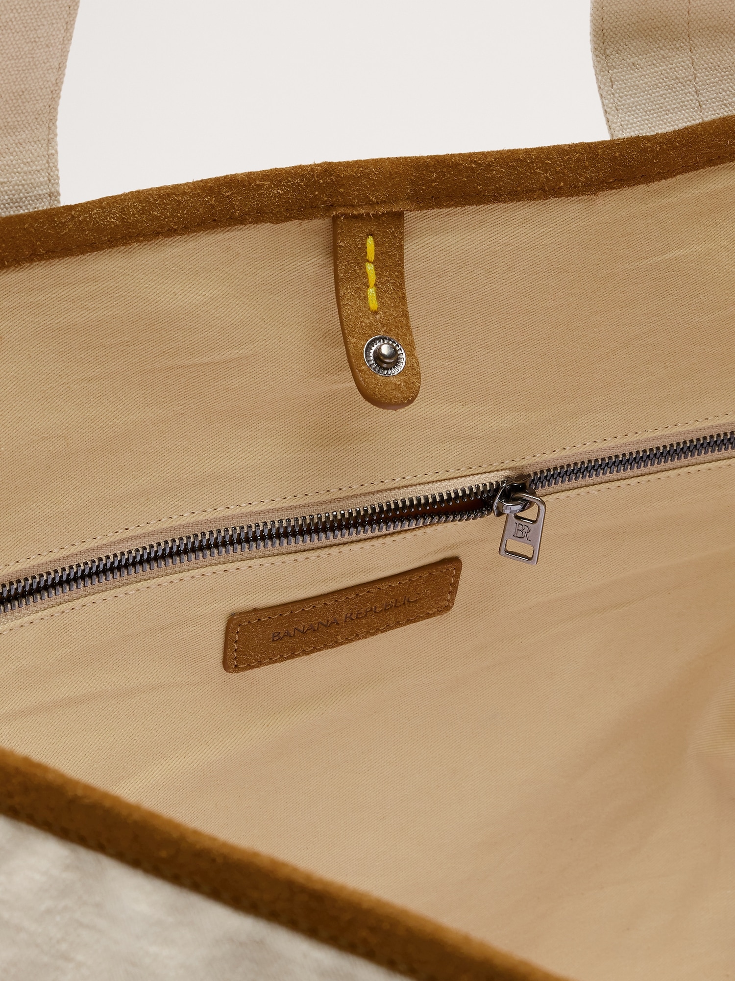 A classic tote in rugged cotton canvas with suede trim, with plenty of pockets inside to keep things organized.