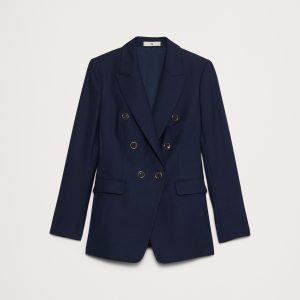 Peak lapel. Double-breasted gold crest button front.