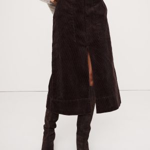 Nothing says cold weather quite like corduroy. Here, we crafted a tailored midi skirt with front and back slits—the better to show off your shoes.
