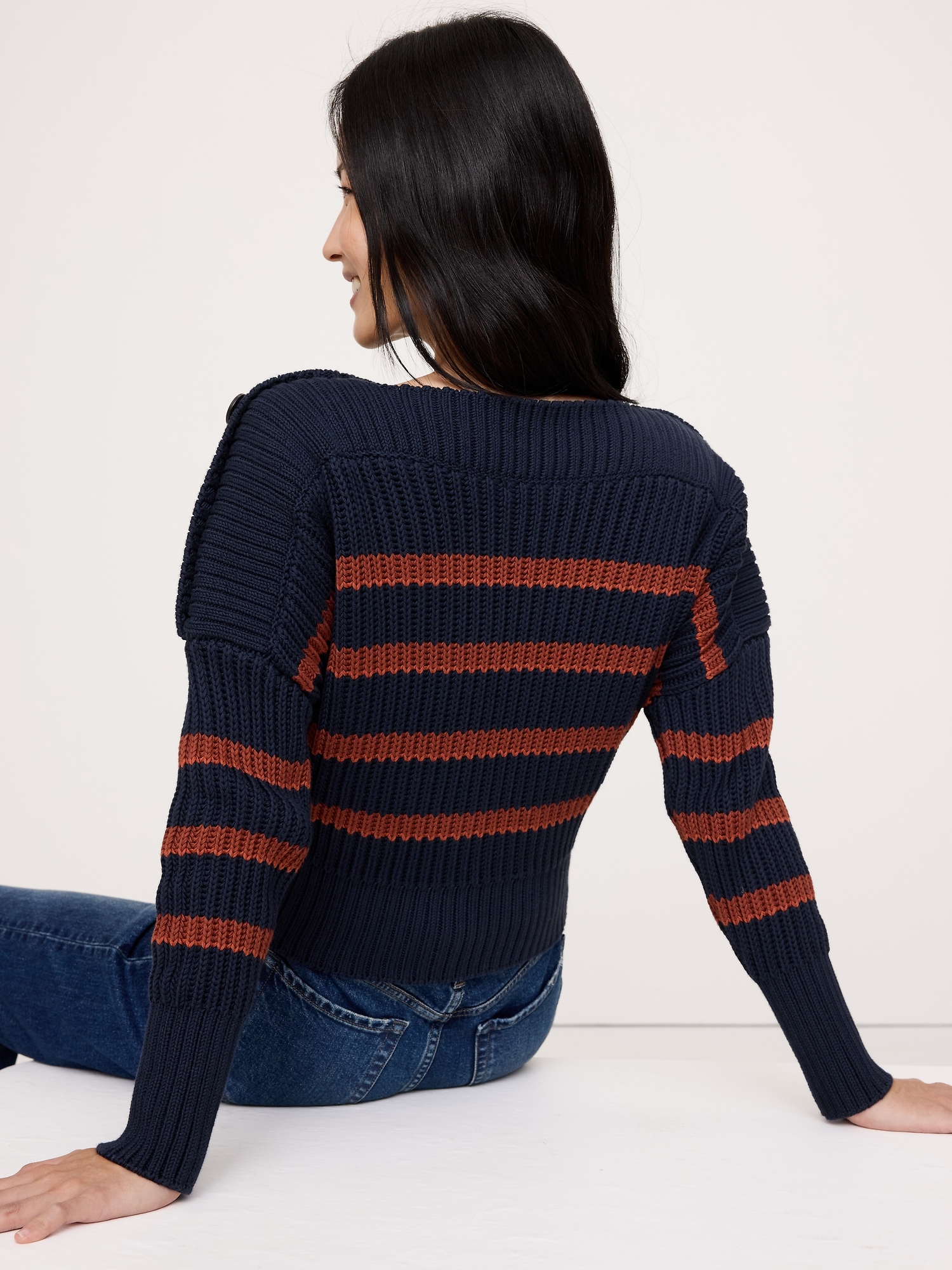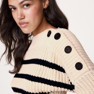 We love a boatneck sweater. Here, we borrowed the button-shoulder detail from a vintage sweater, and recreated it in one of our favorite organic cotton yarns—one we love for its softness and all-season weight.