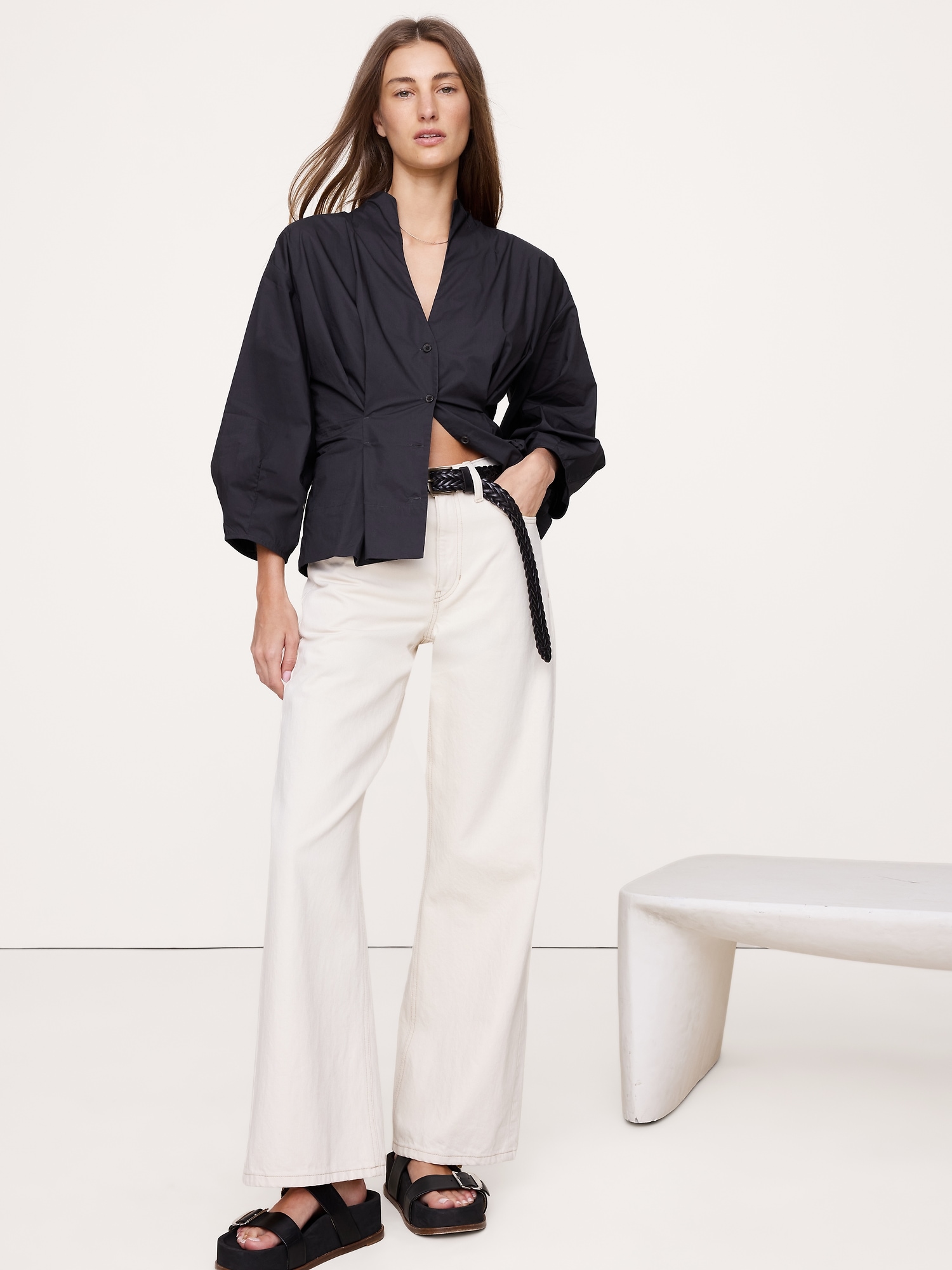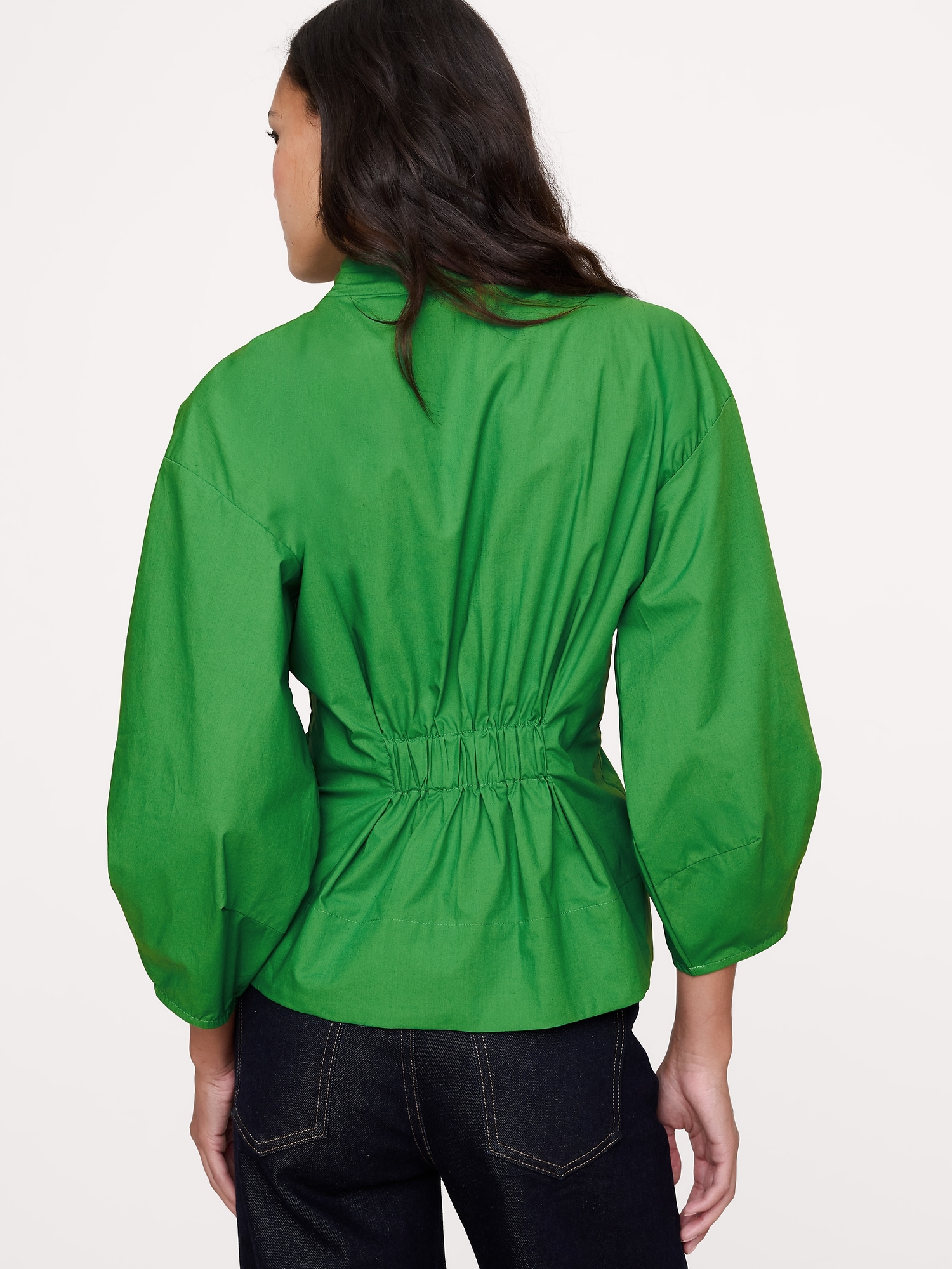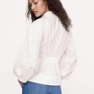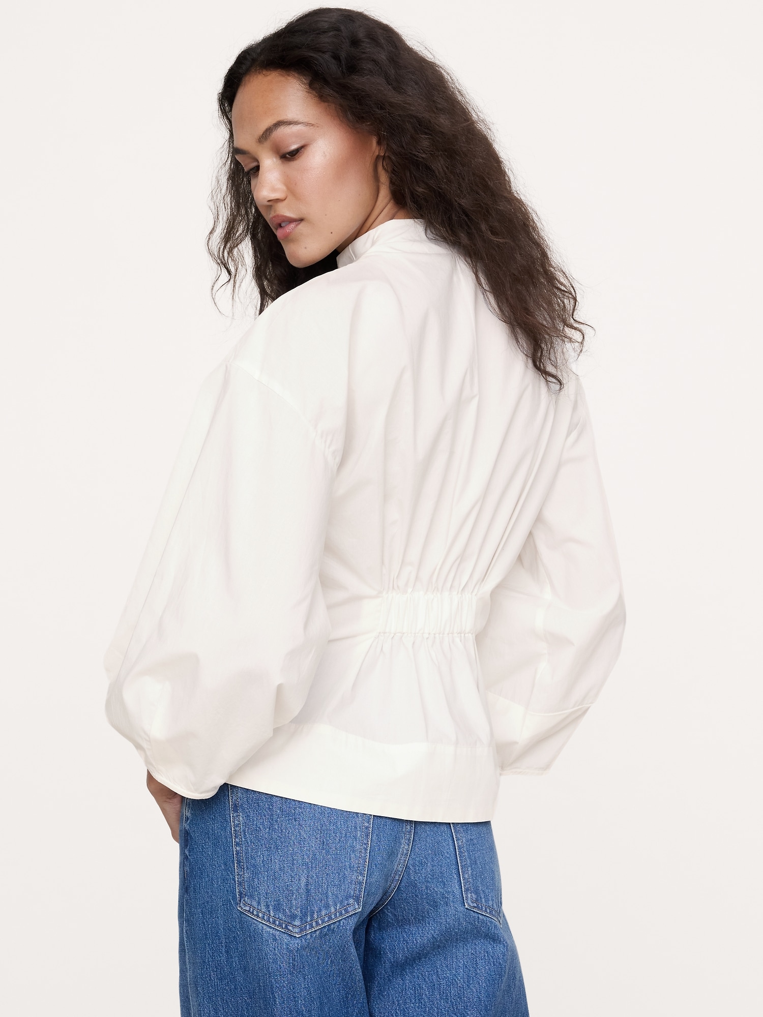 A fun and flirty take on the classic poplin shirt, this one has blouson sleeves here, as well as pleats at the waist and a cinched detail at back.