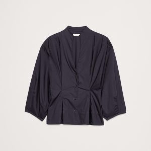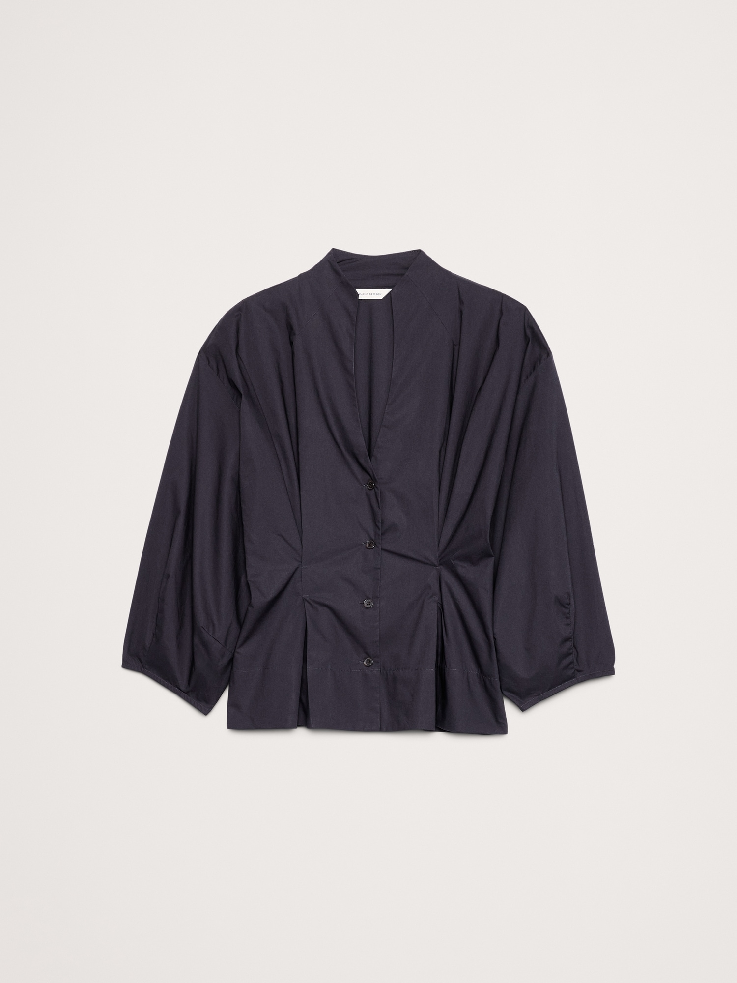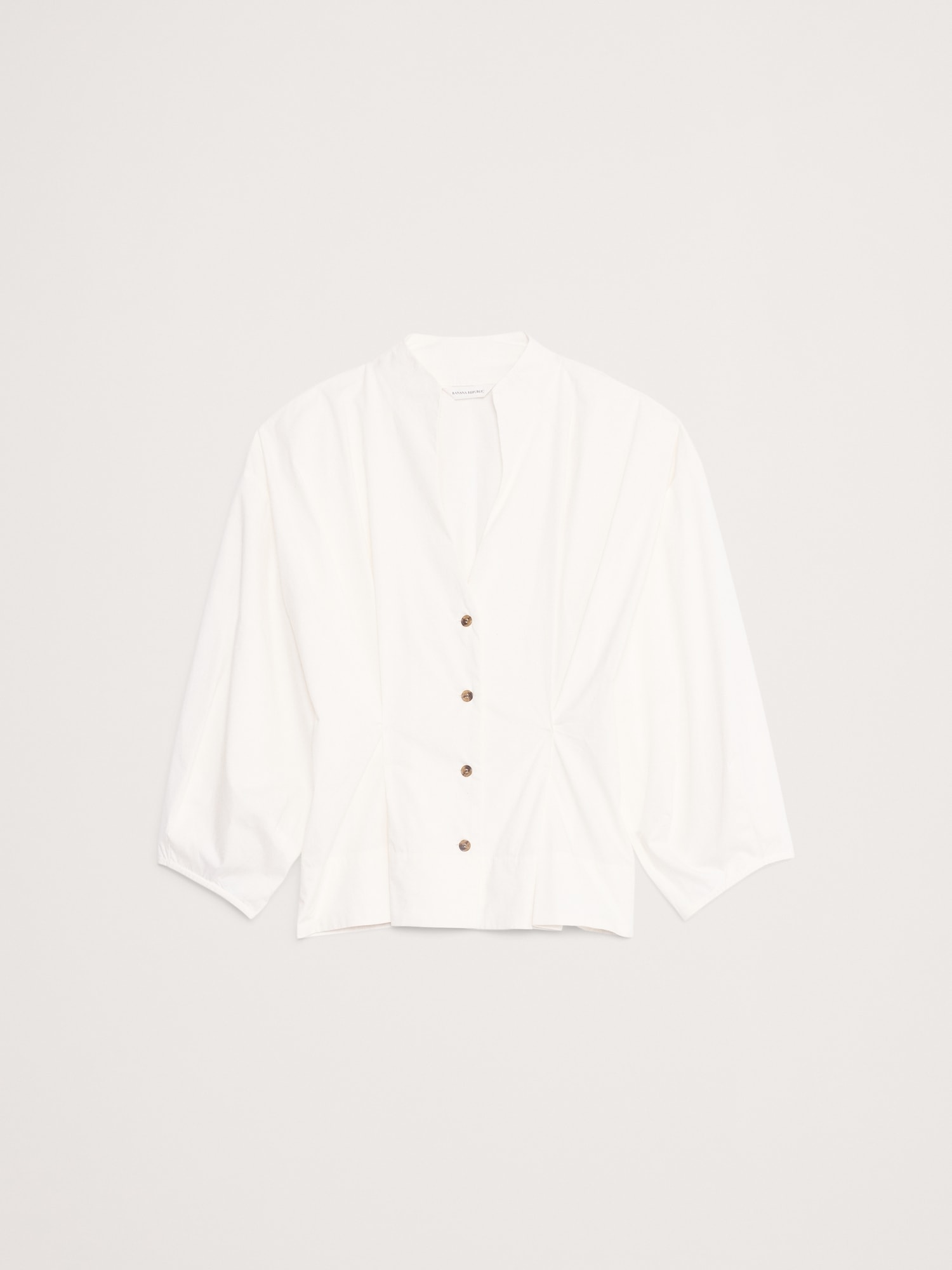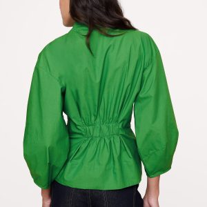 A fun and flirty take on the classic poplin shirt, this one has blouson sleeves here, as well as pleats at the waist and a cinched detail at back.