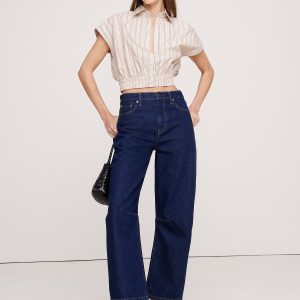 An invitation to play with proportions. This reimagined collared shirt has elastic at the hem and a tapered fit through the body that creates a sharp-shouldered silhouette.