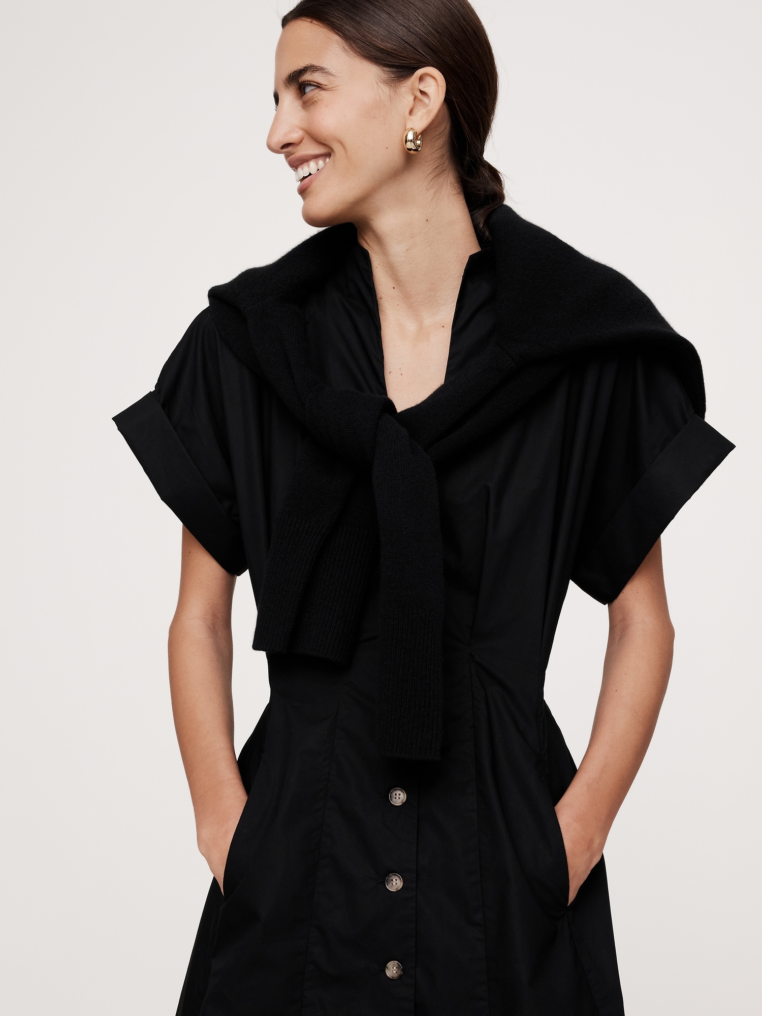 We can’t decide what we love most about this dress: the low, collarless neckline or the seamed accents that gather into pleats that define the waist. We cut it in our signature cotton poplin so you can style it now with ankle boots and an oversized shirt jacket and wear it later with sandals and a big beach hat.
