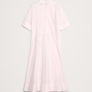 Bring on the sunshine. This is a relaxed shirt dress with a tuxedo-style front panel detail at the bodice, a tiered skirt, and an extra wide hem to add a little flounce.