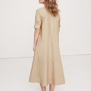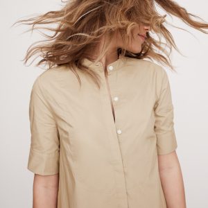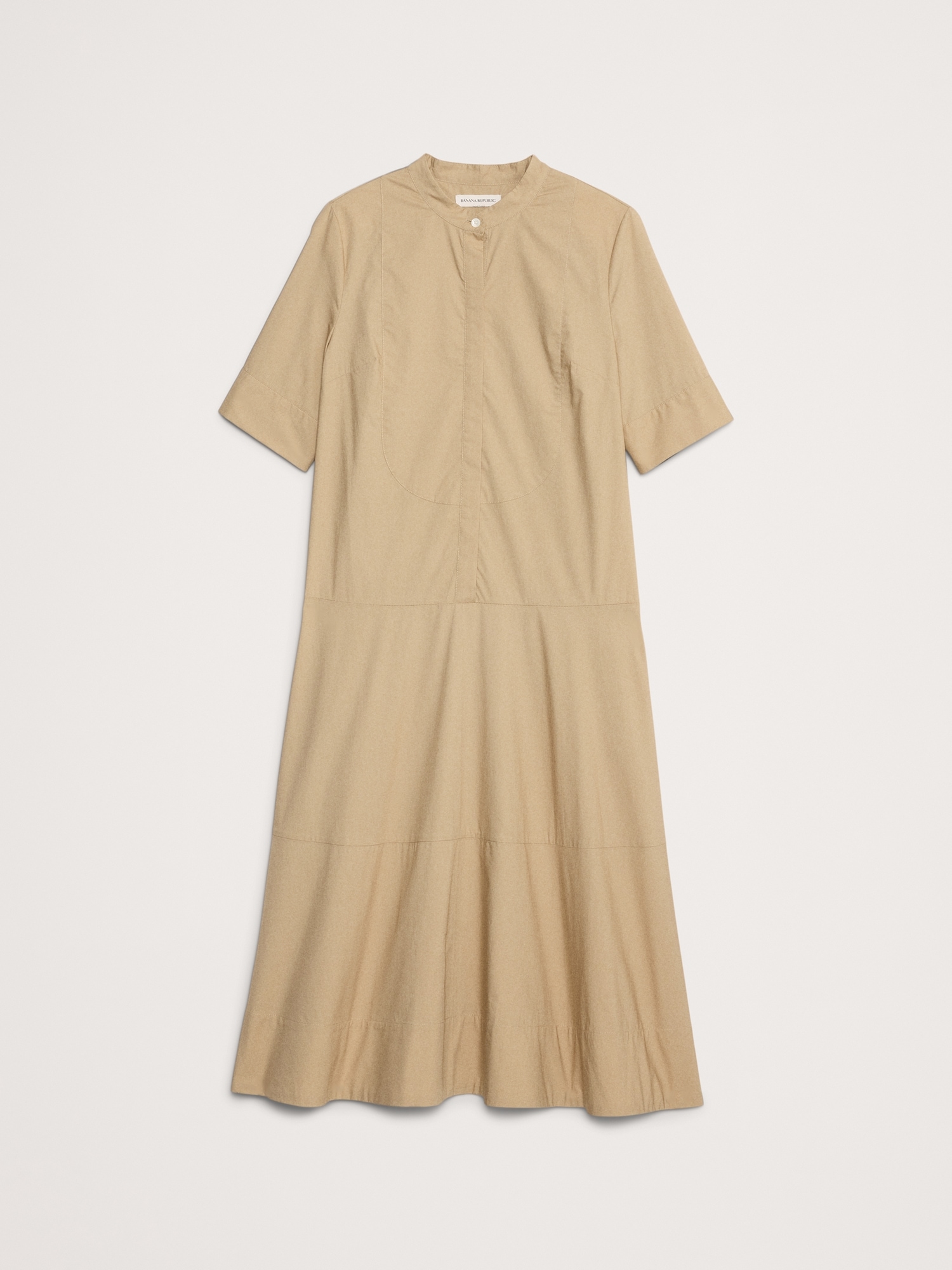 Bring on the sunshine. This is a relaxed shirt dress with a tuxedo-style front panel detail at the bodice, a tiered skirt, and an extra wide hem to add a little flounce.