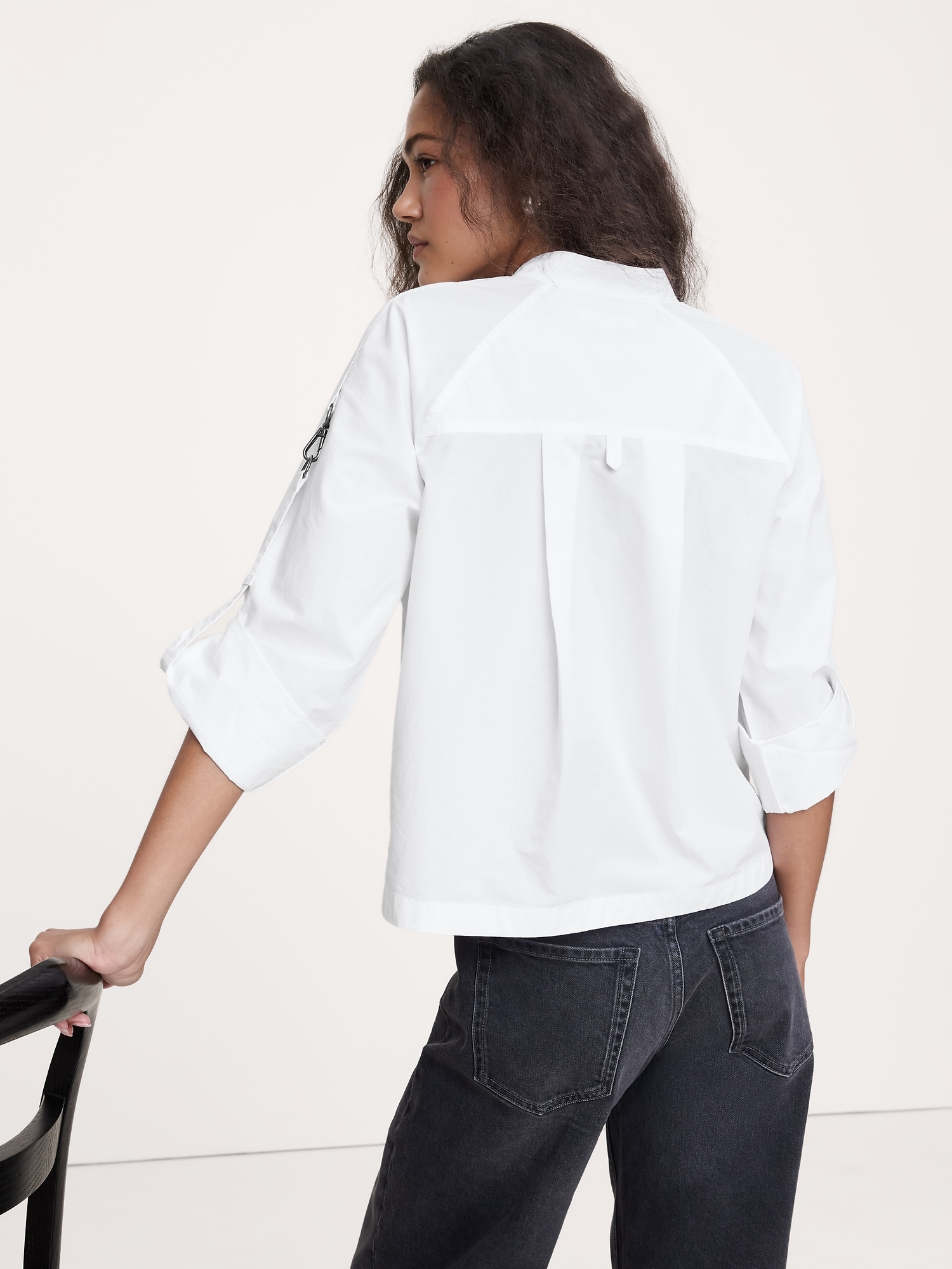 A classic popover, with a utilitarian twist thanks to a zip-front placket, banded collar, and roll-tab sleeves with clip hardware—in our 100% cotton poplin.