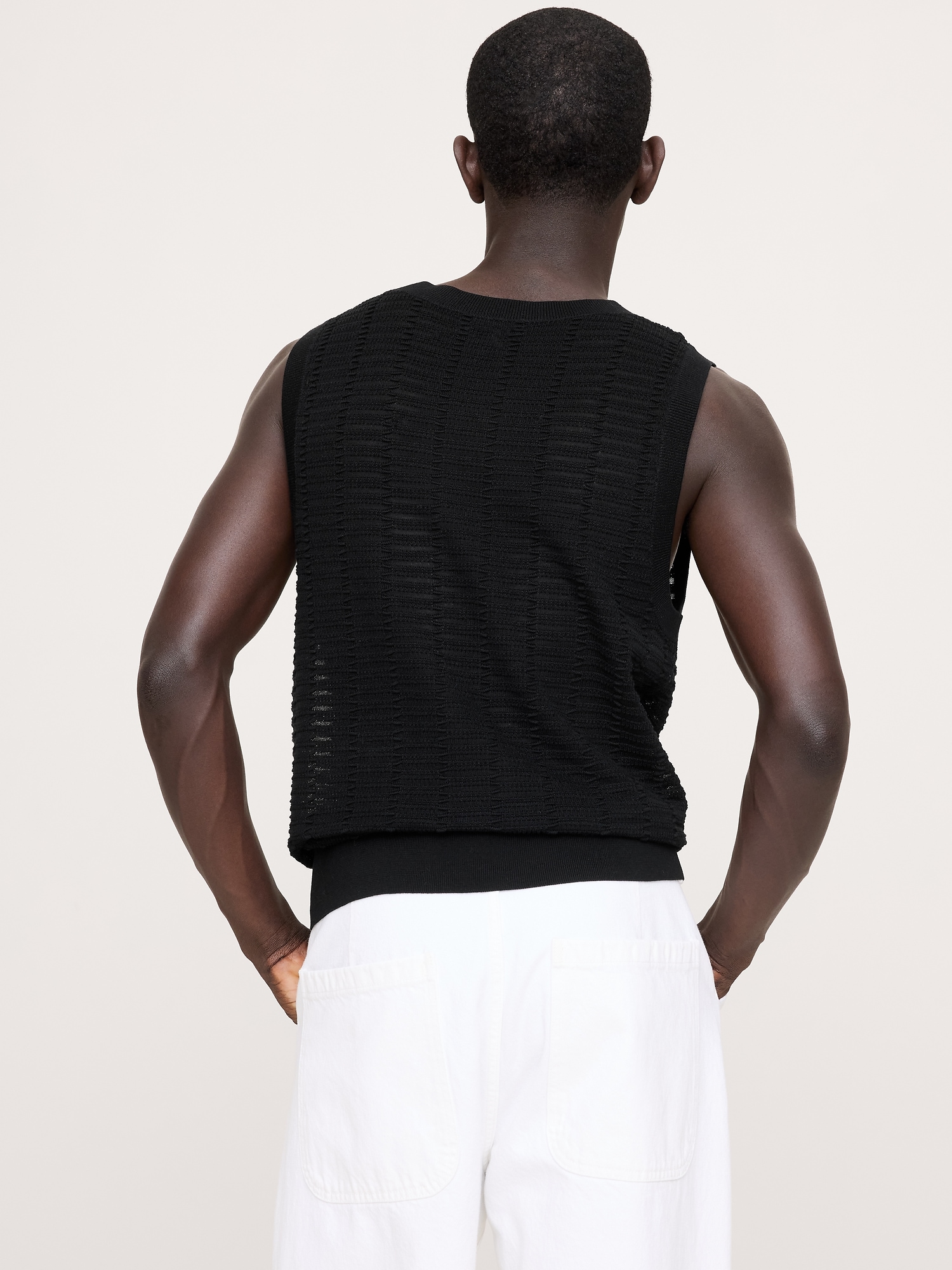 Our take on the season’s mesh tank trend, this cotton tank has an open, geometric pattern in 100% organic cotton.