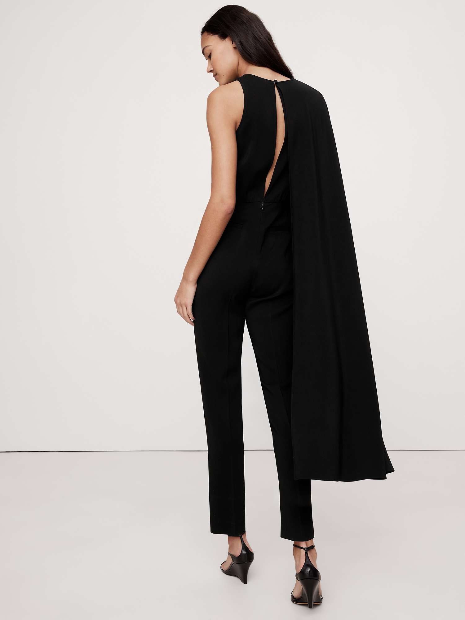 Your sign to RSVP yes. Crafted from a matte crepe fabric with cape shoulder detail, this jumpsuit has a slim fit through the hips with a slim, tapered leg.