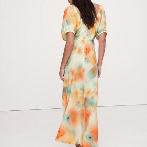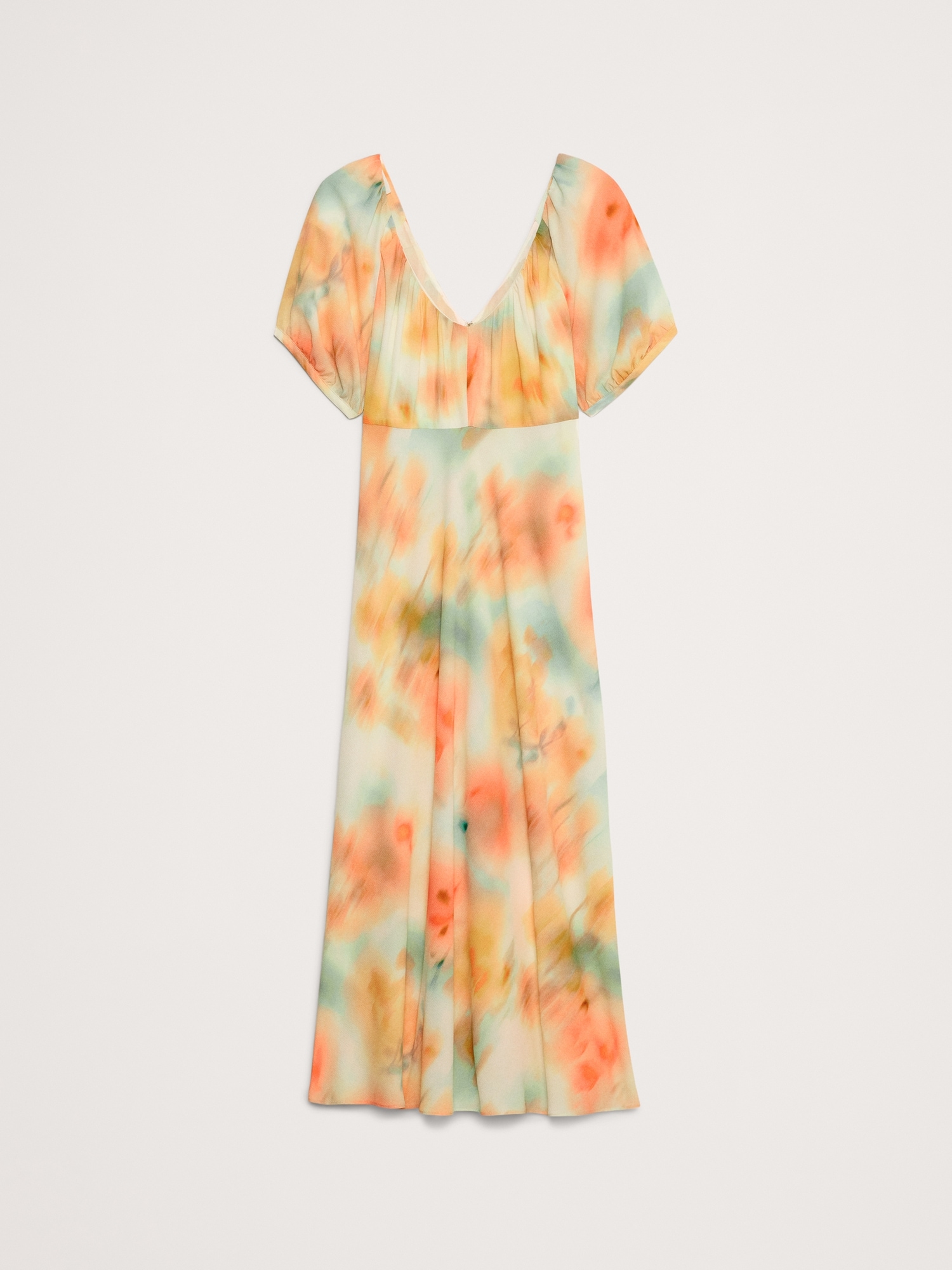 Designed with an easy fit, blouson sleeves, and a crepe fabric, we love the ruched detail at the neck and sleeves of this dress. Another thing we love? The skirt is cut on the bias so it’s super flowy.