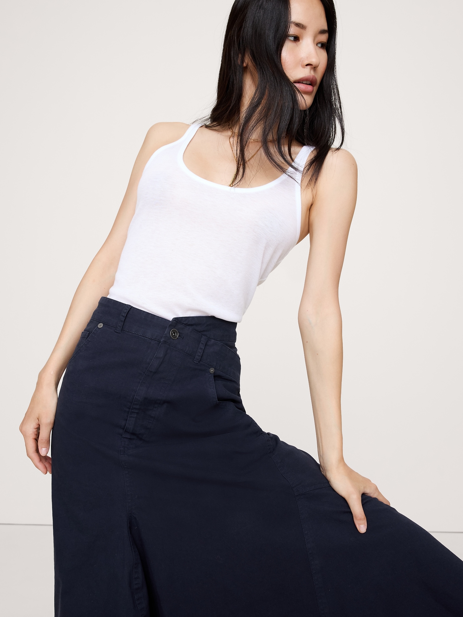 Deconstructed, reconstructed. We borrowed the five-pocket styling of your fave pair of jeans for a twisted midi skirt with crossover waistband. Cut in a soft-but-sturdy cotton canvas and finished with a garment wash for softness and lived-in color.