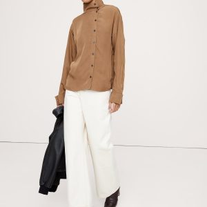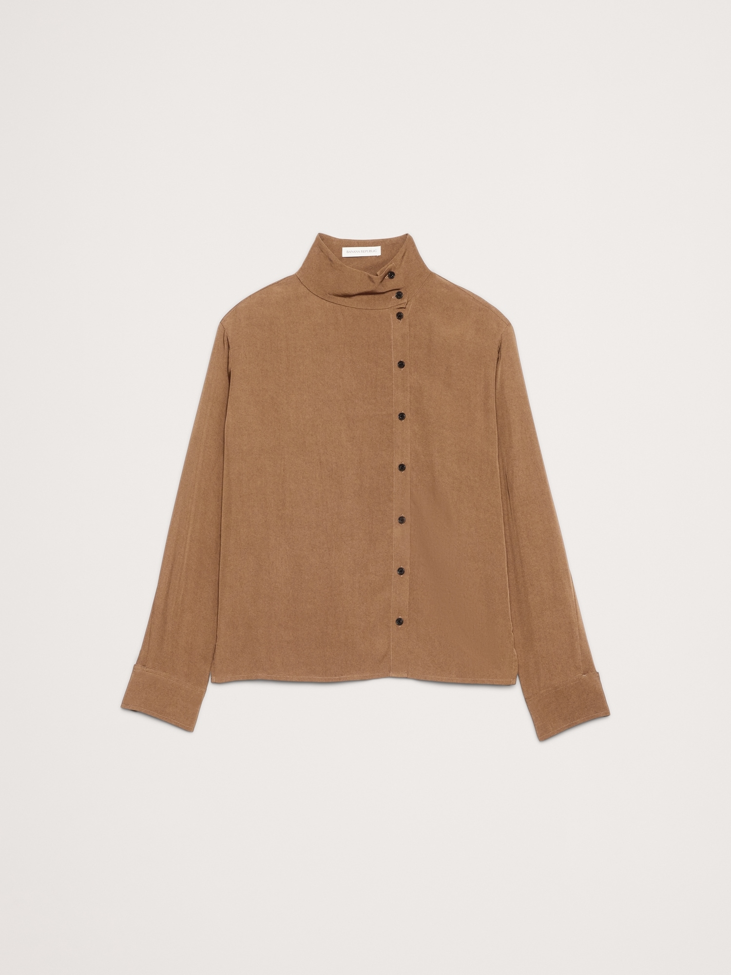A classic button-down shirt with a twist. We offset the button placket and opted for a stand collar—leave it buttoned all the way up or unbutton a few for an asymmetrical neckline. Cut in our drapey twill so it’s a bit more dressed up.
