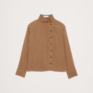 A classic button-down shirt with a twist. We offset the button placket and opted for a stand collar—leave it buttoned all the way up or unbutton a few for an asymmetrical neckline. Cut in our drapey twill so it’s a bit more dressed up.