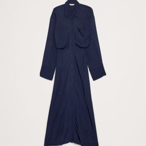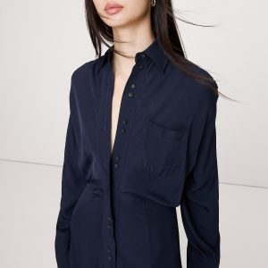 We love a shirt dress because you can wear them basically everywhere. Here, we kept the fit easy through the shoulders and chest, but defined the waist. Cut in our drapey twill so it’s a bit more dressed up. Blouson fit: Relaxed through chest and shoulders, defined waist with an A-line skirt. Point collar with button front. Chest pocket. Unlined. #817701