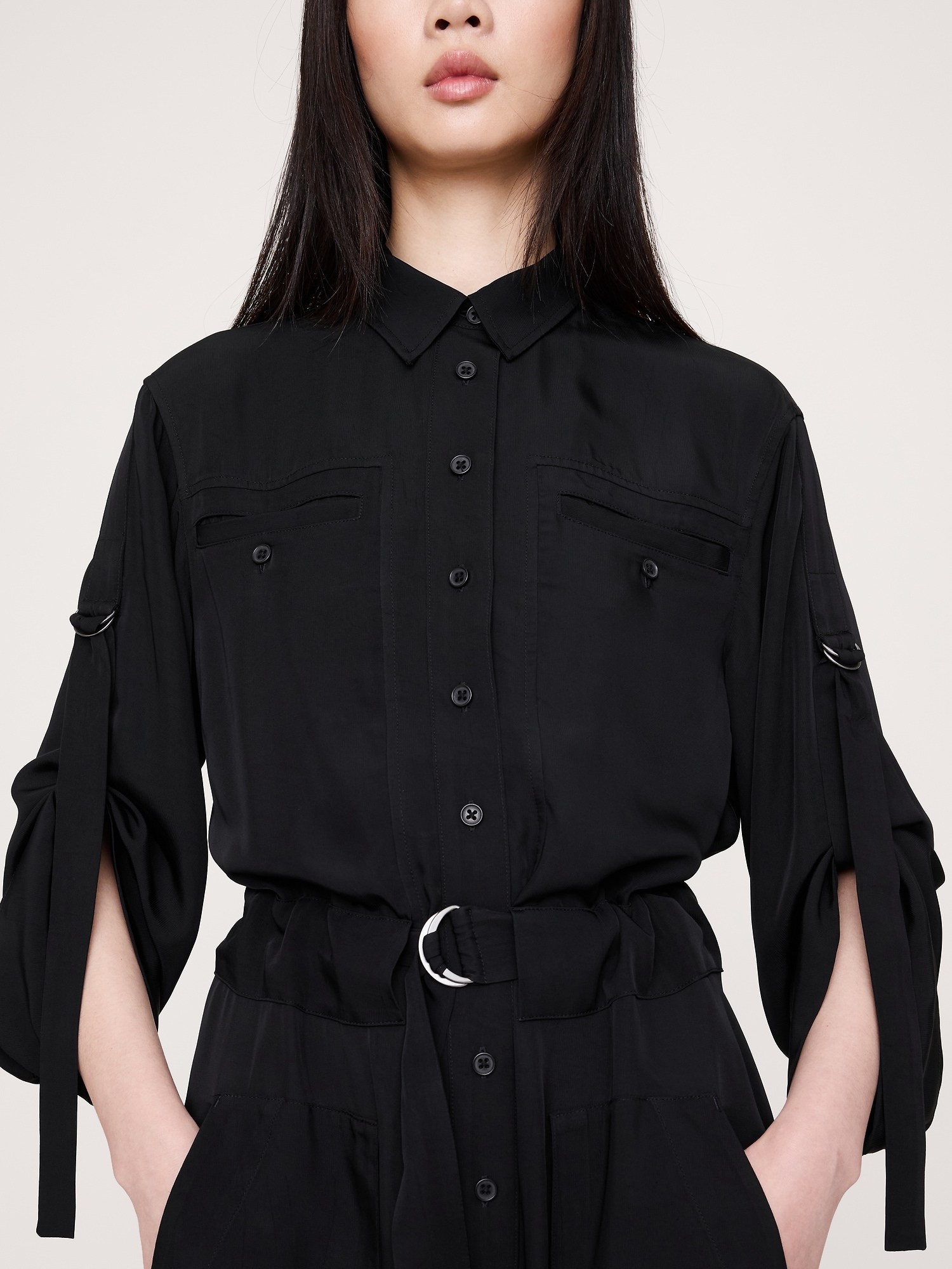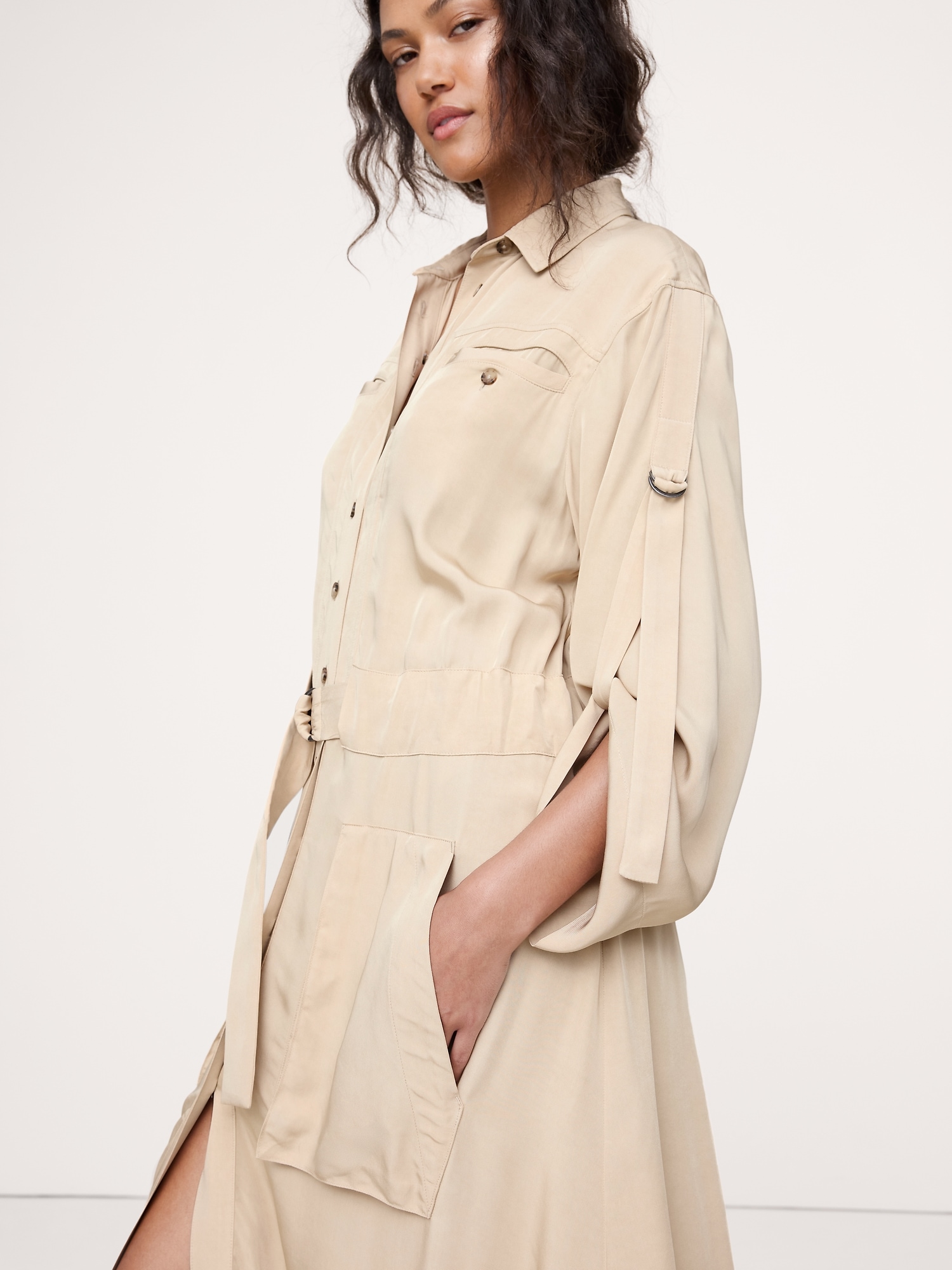 Always put-together, we love a shirt dress because you can wear it basically everywhere. Here, we imagined it with utility pockets in our drapey twill so it’s a bit more dressed up.