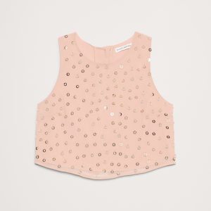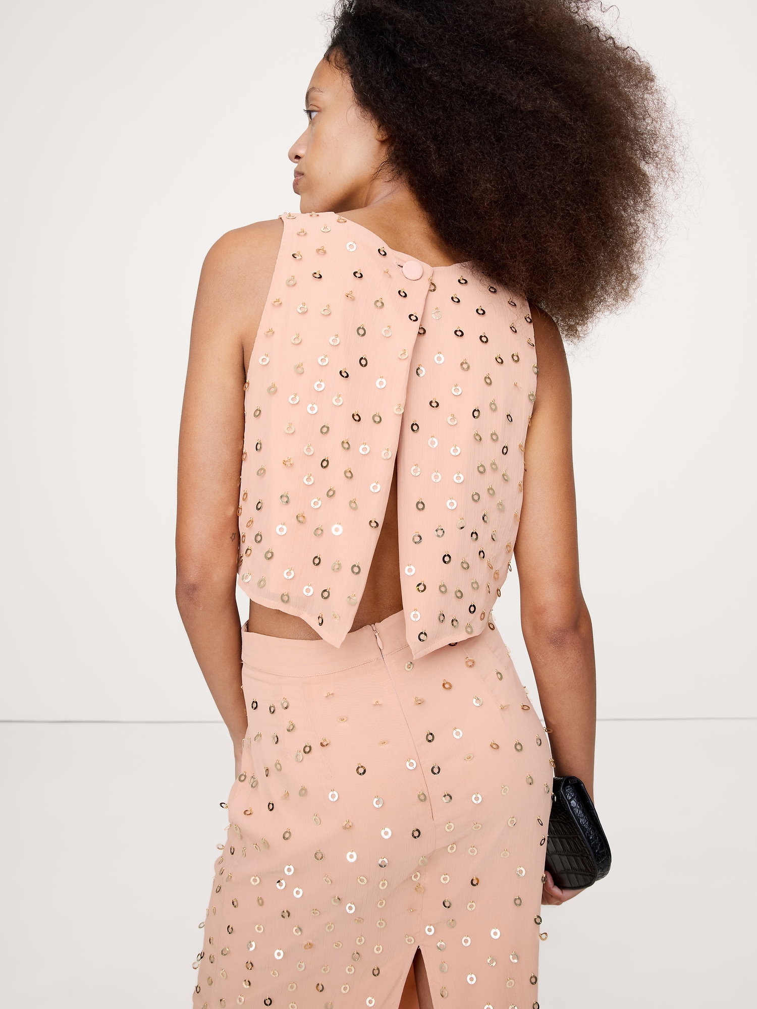 A top to make dressing-up feel effortless, we cut this one from chiffon embellished with gold paillettes and left the back open with a little overlap.