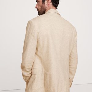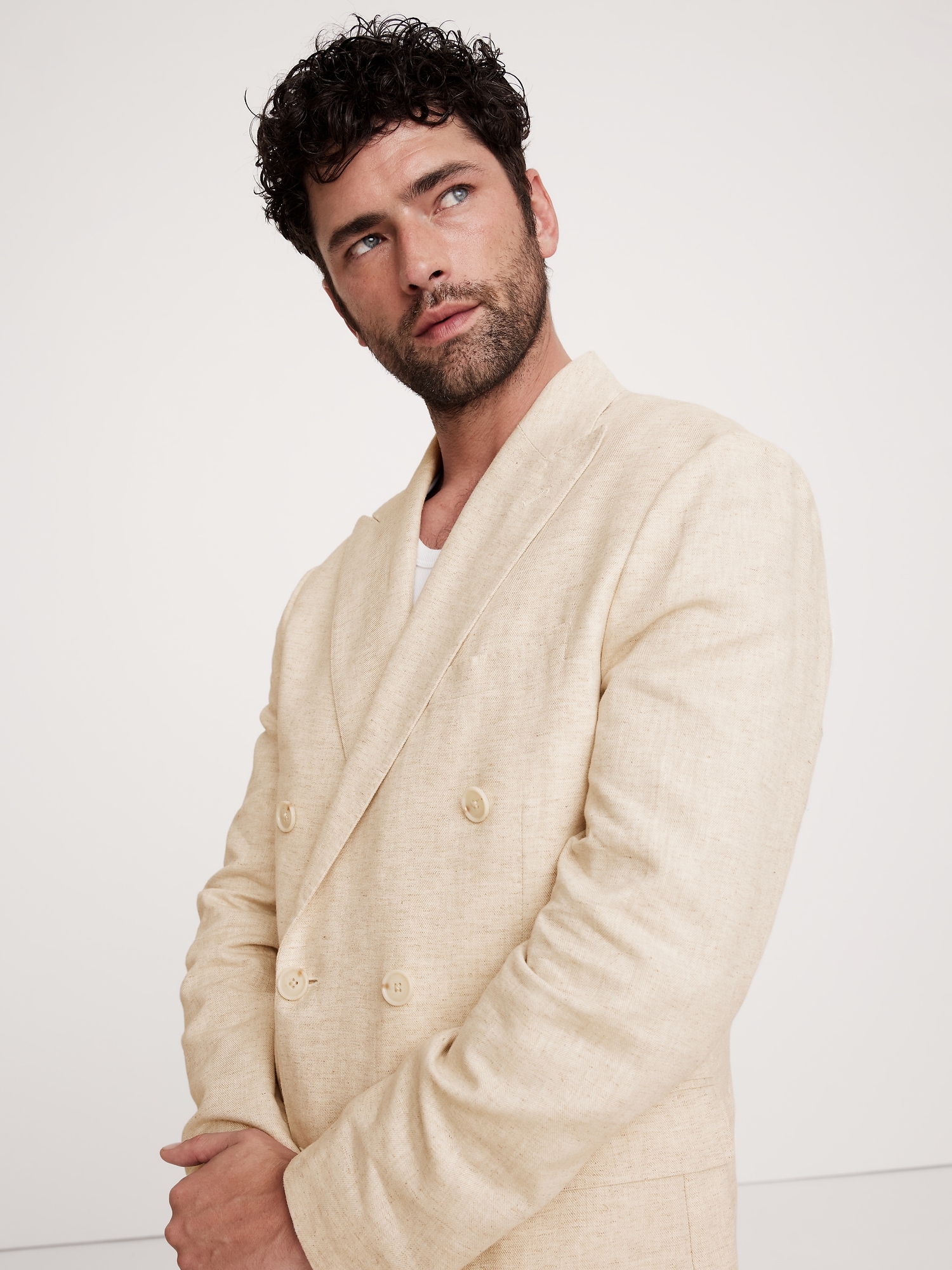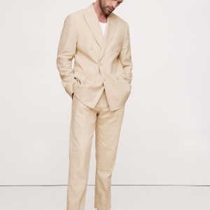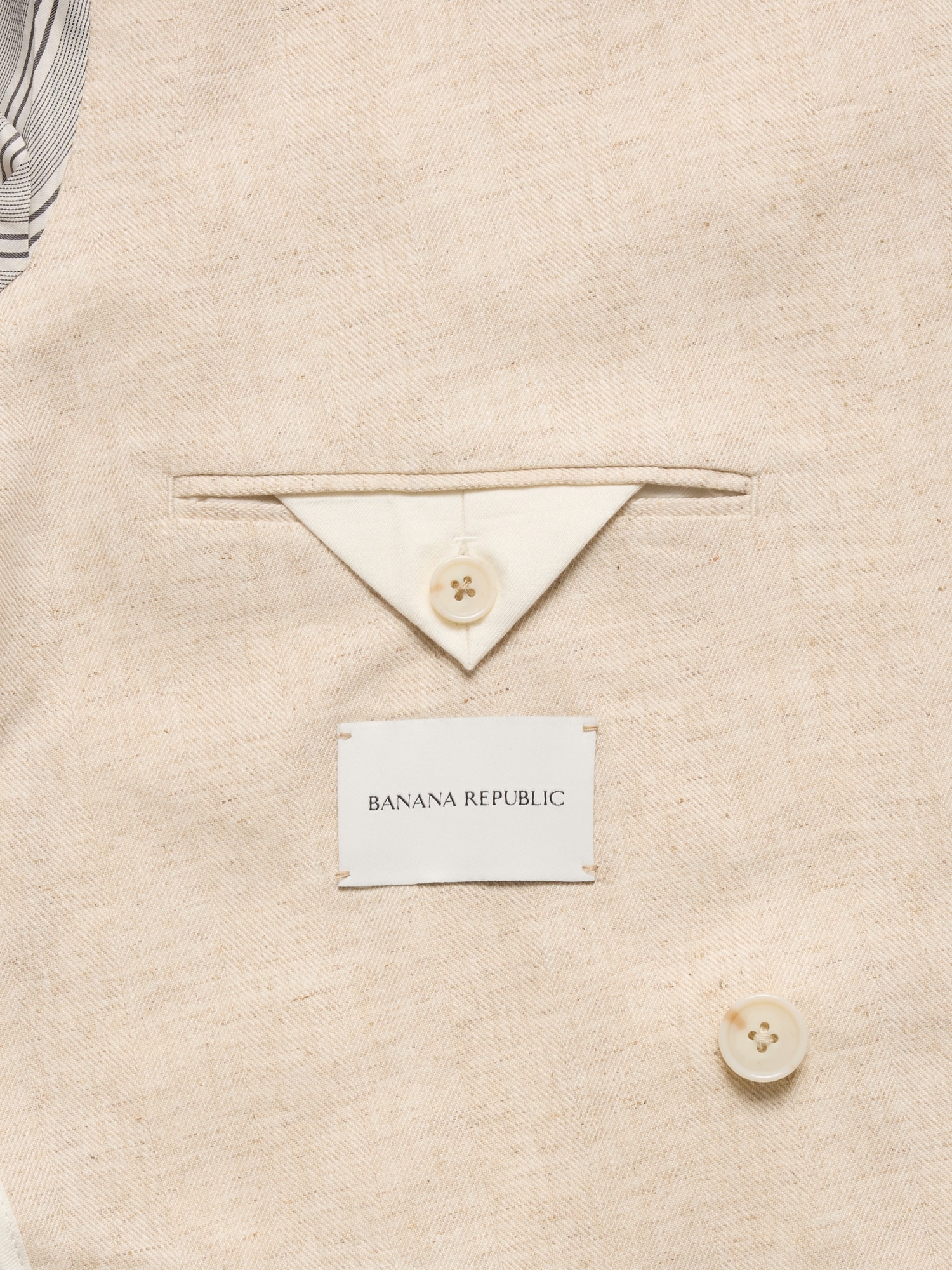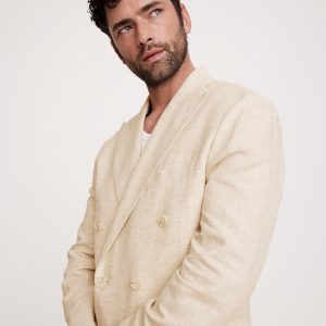 Designed with warm weather in mind, this double-breasted suit jacket is cut from an herringbone fabric that blends soft cotton and luxurious linen. Here, we left the jacket unlined through the back for even better breathability.