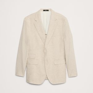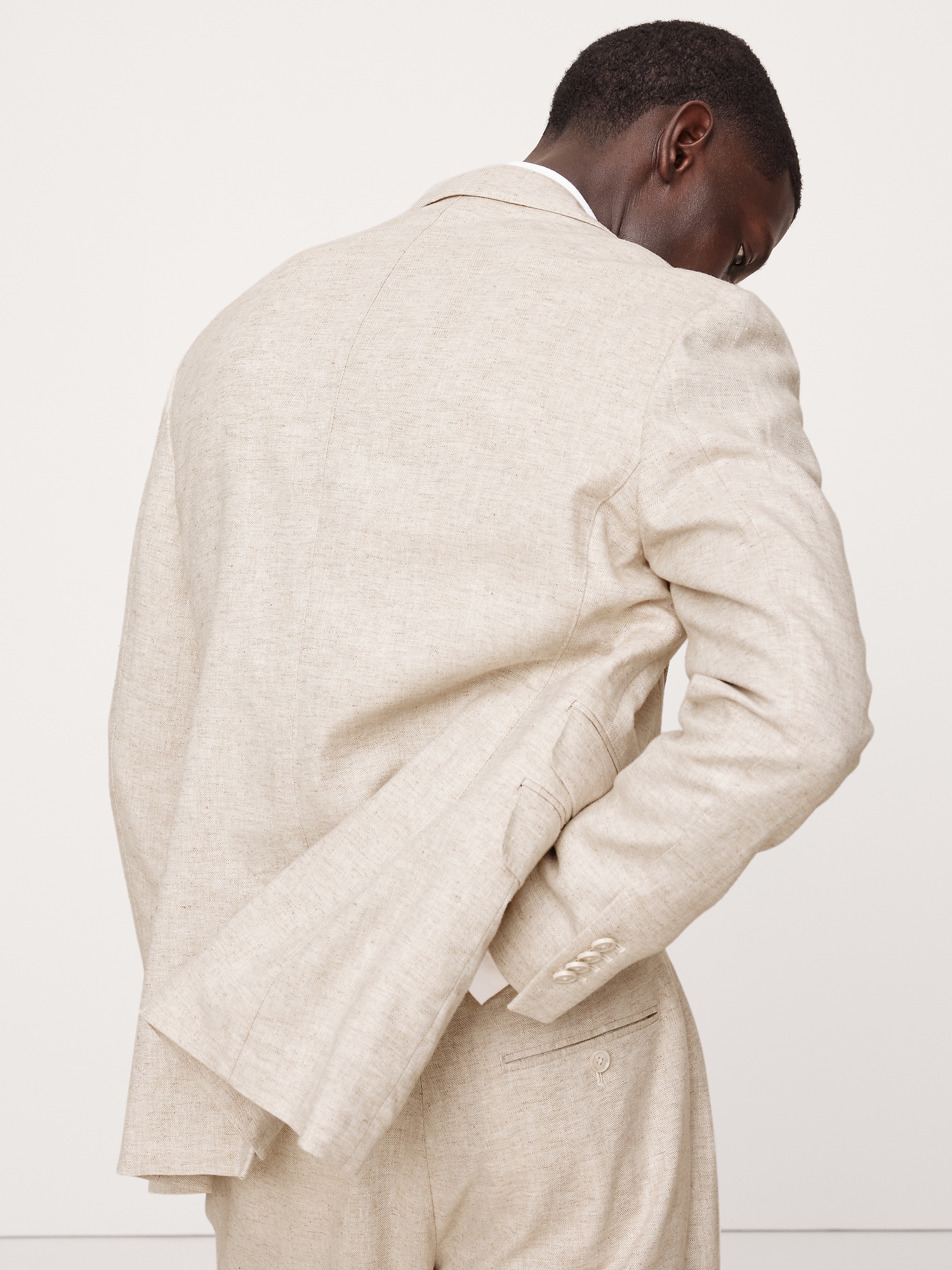 Designed with warm climates in mind, this sleek suit jacket is cut from an herringbone fabric that blends together soft cotton and luxurious linen. Here, we left the jacket unlined through the back for even better breathability.