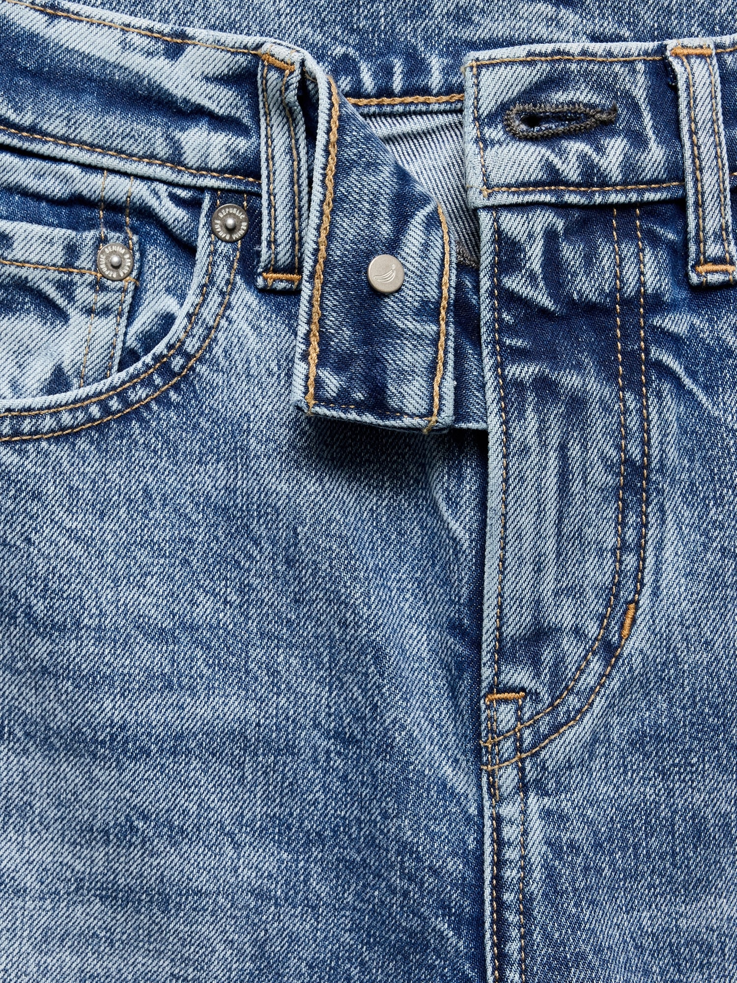 Zip fly with button closure. Belt loops.