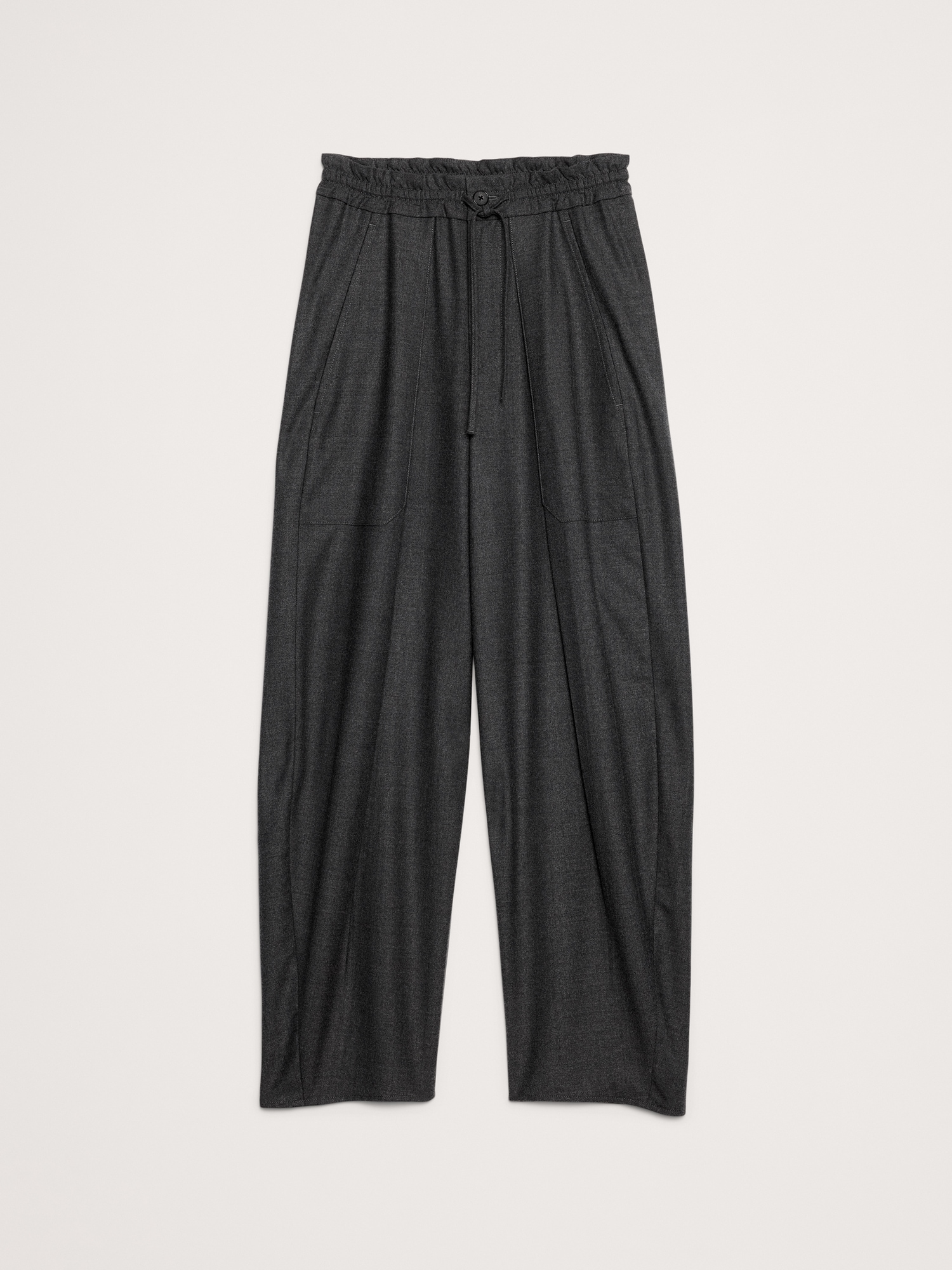 Our take on the season’s barrel-leg pants, cut in an wool-blend flannel we love for its smooth look and high stretch. Plus, we opted for a drawstring waistband, pleated front, and pull-on design.