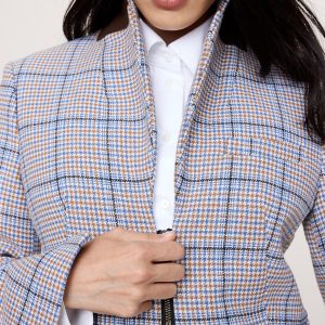 A playful take on a structured blazer, we reached for a beautiful houndstooth plaid fabric from Italy, adding a zip front closure and zips at the cuffs. Leave the cuffs unzipped to let your shirt cuffs peek through.