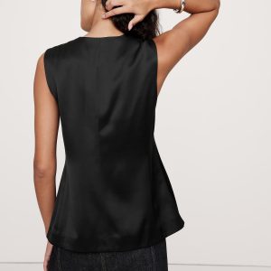 We styled this tailored vest in a longer length with a lapel-free neckline, leaving you to style it layered as a vest or on its own as a top. Here, we reached for an Italian satin fabric with a touch of wool, which adds a touch of warmth and sophistication.