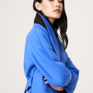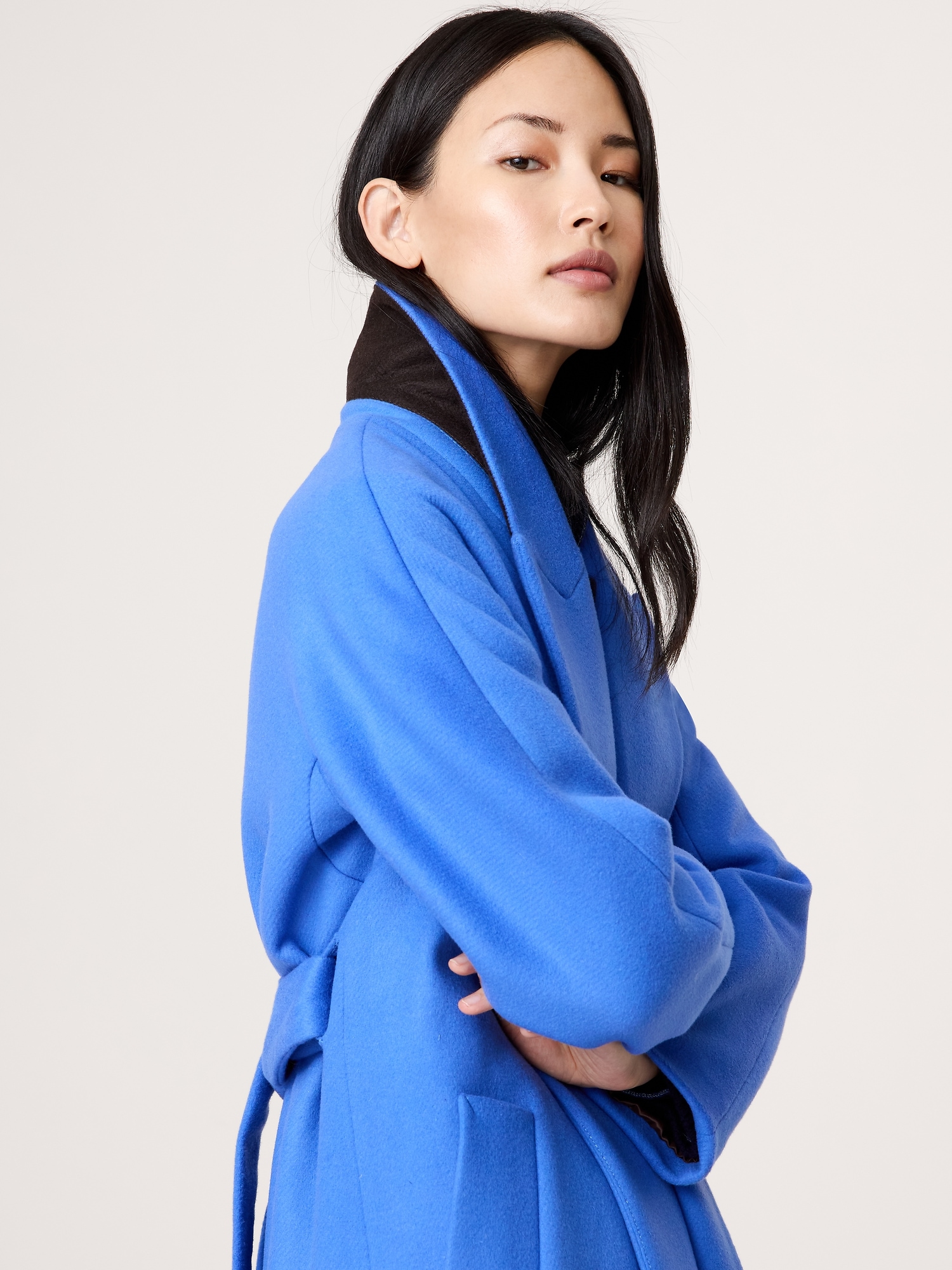 Our version of the season’s wrap coat, cut in an oversized silhouette from a warm Italian fabric woven from virgin wool and cashmere.