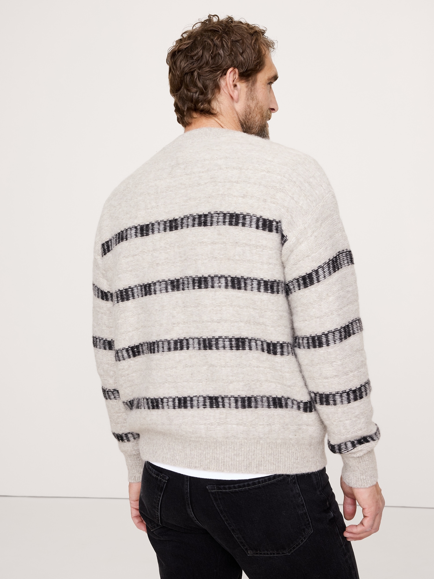 A v-neck sweater with a vintage vibe. Look closely: this one achieves its subtle, tonal stripe by mixing both colors and stitch types, in a soft and warm blend of alpaca, wool, and nylon.