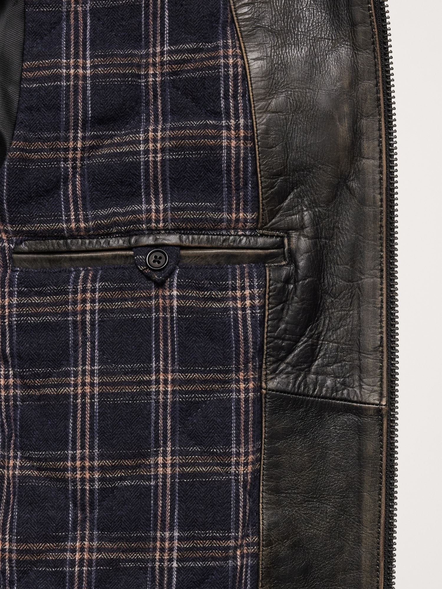 Zip-front chest pockets. Side pockets. Interior welt pocket.