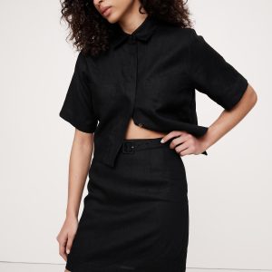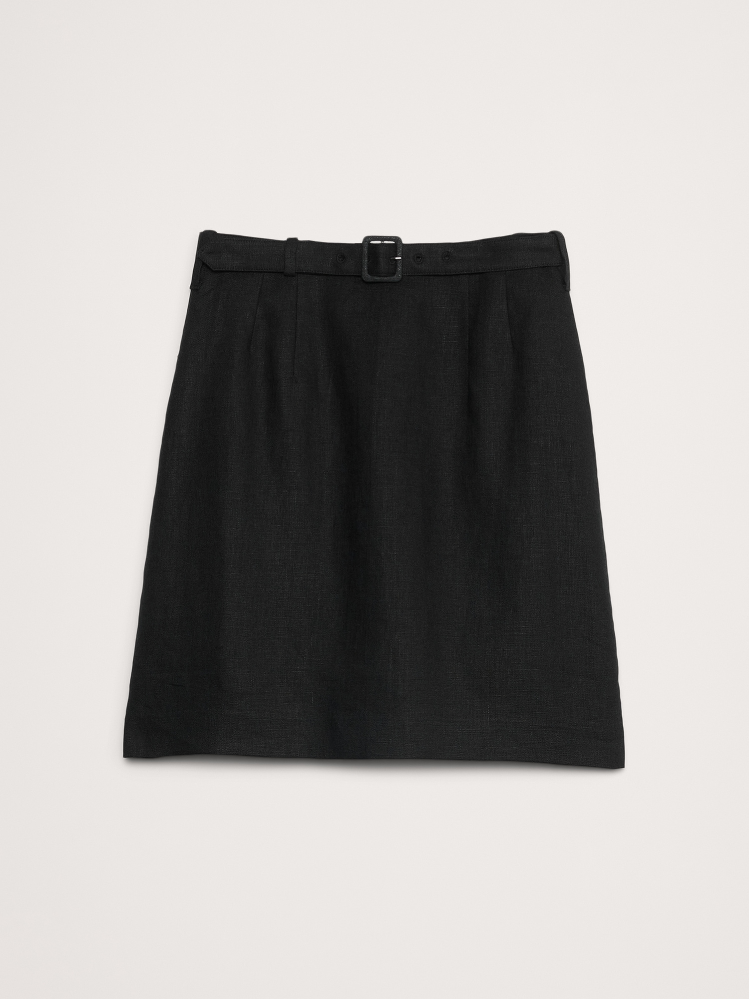 A little linen mini skirt. This tailored skirt is cut from certified-European flax linen with premium details: a removable belt with covered buckle, darts at the waist, and a full lining in lightweight cotton. Make it a set with the matching cropped shirt.