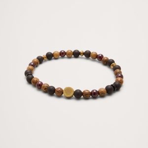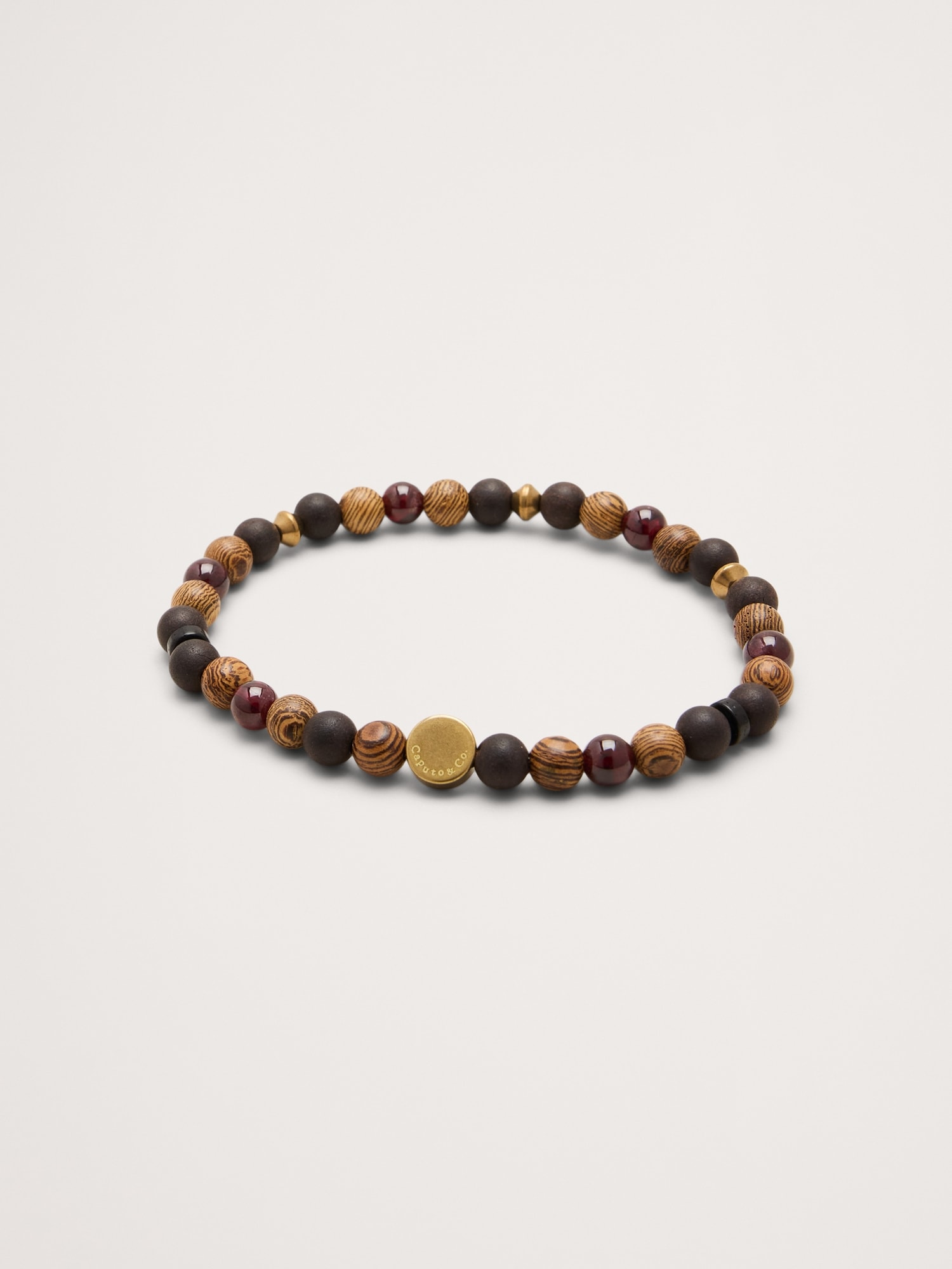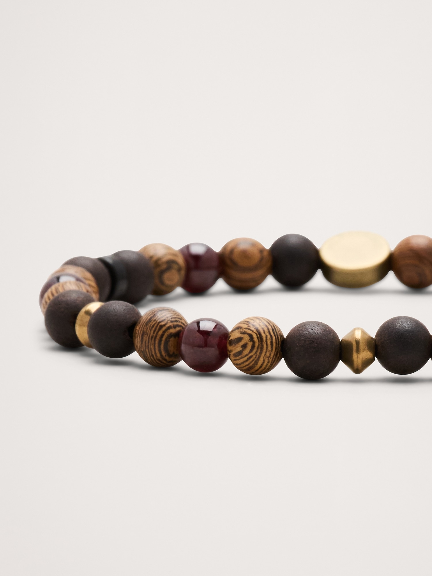 Beads of mala wood, antique brass and your choice of either labradorite or garnet beads.