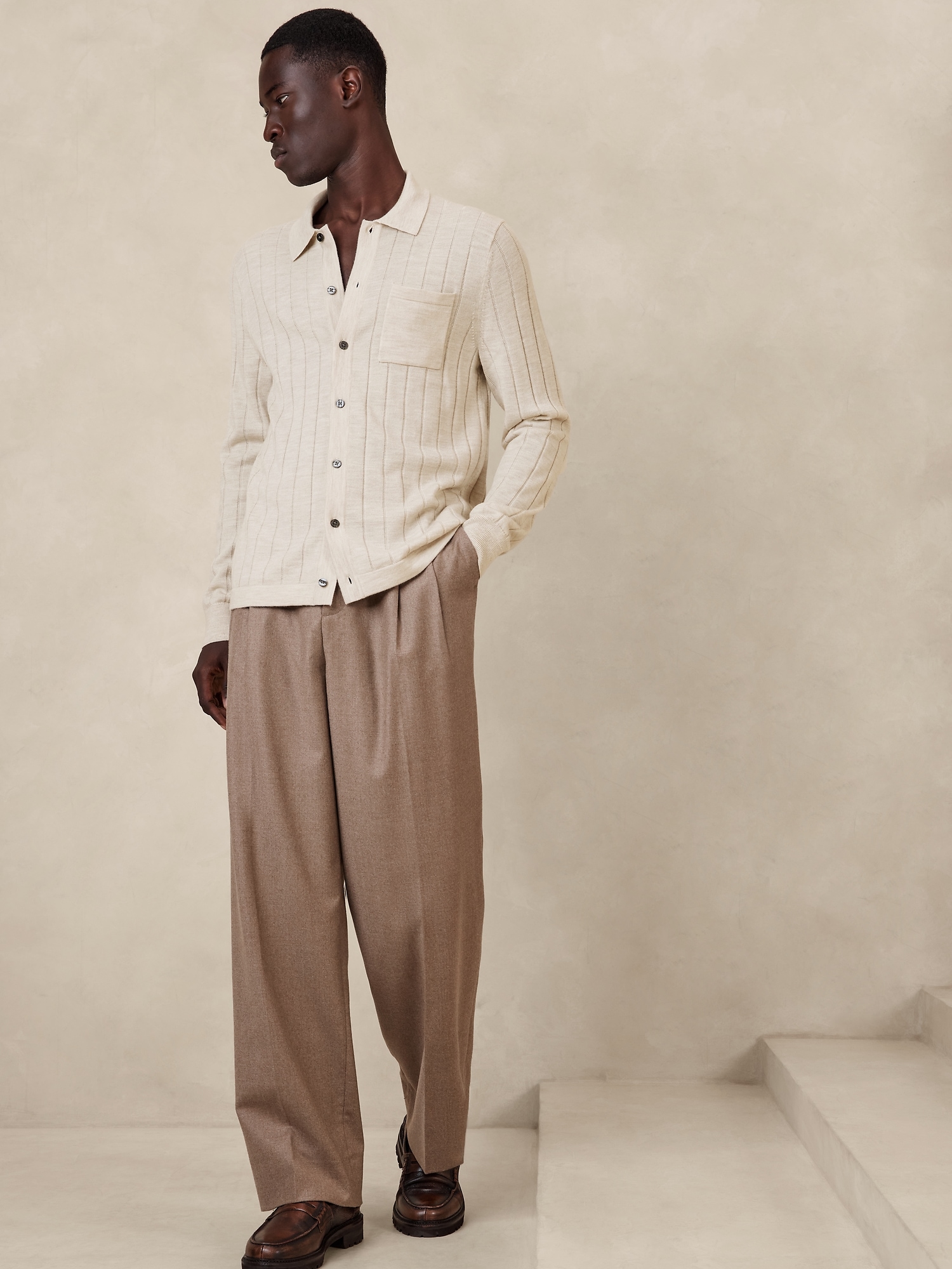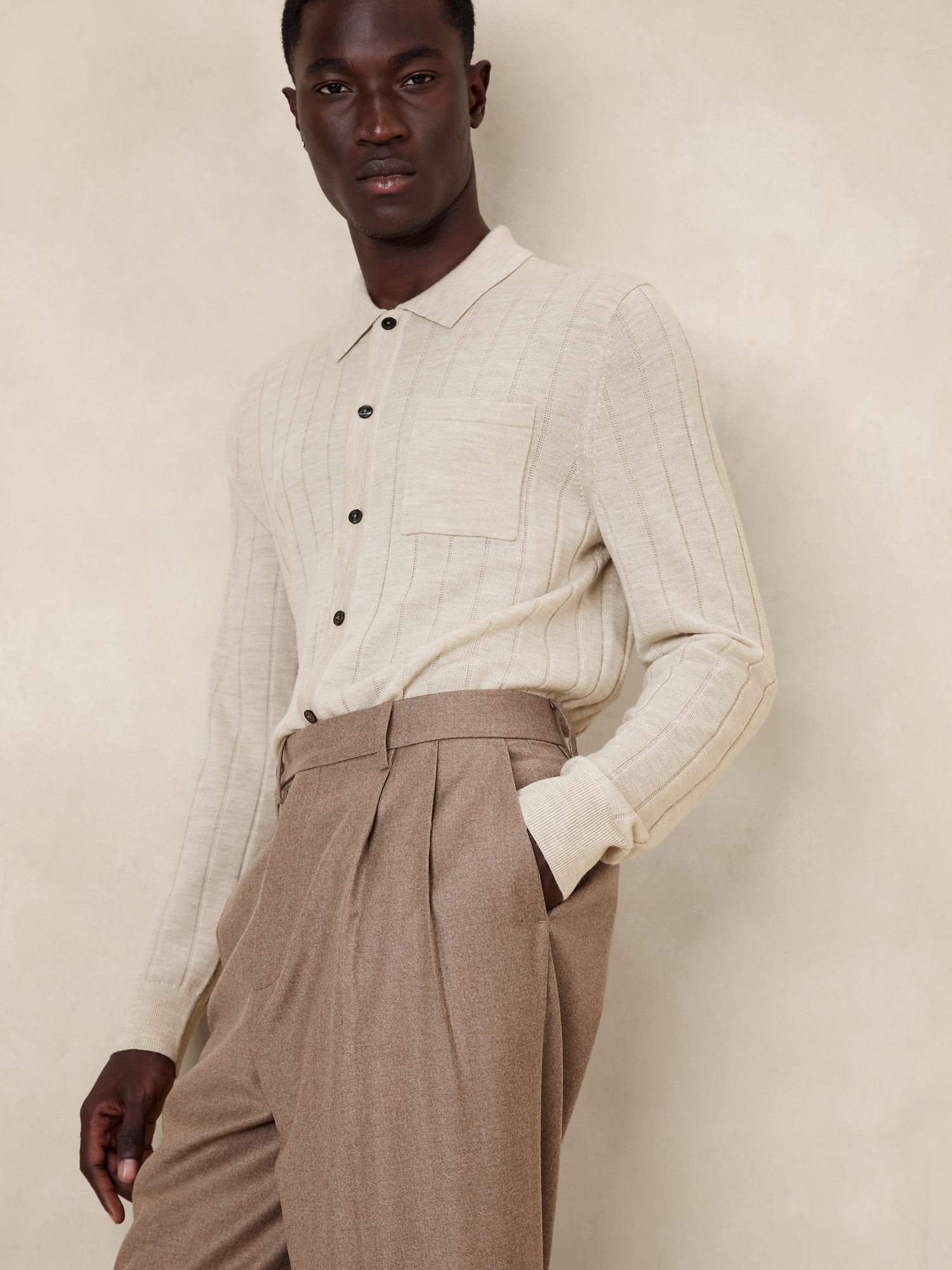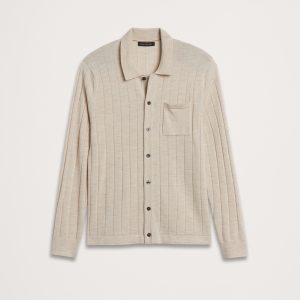 We reimagined the cardigan sweater with sweater polo details to create this warm, Merino wool sweater. A wide, ribbed-knit stitch and chest pocket detail add retro appeal.