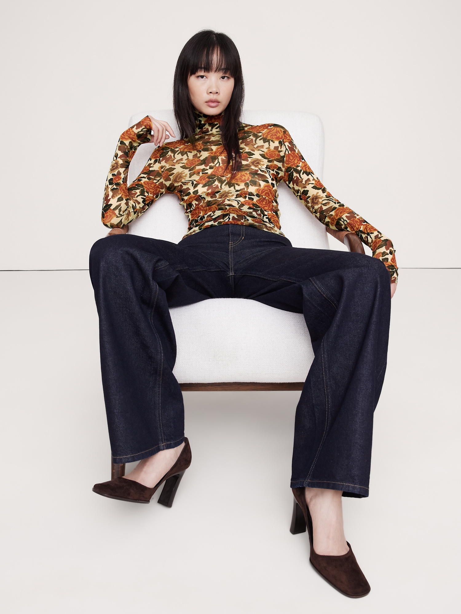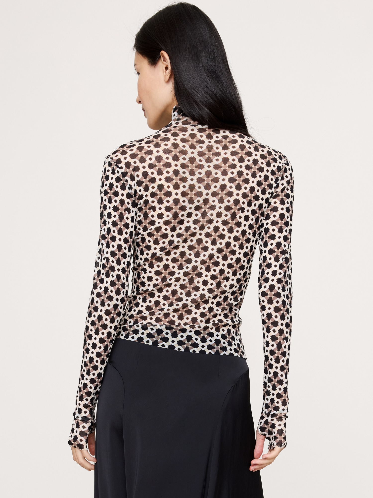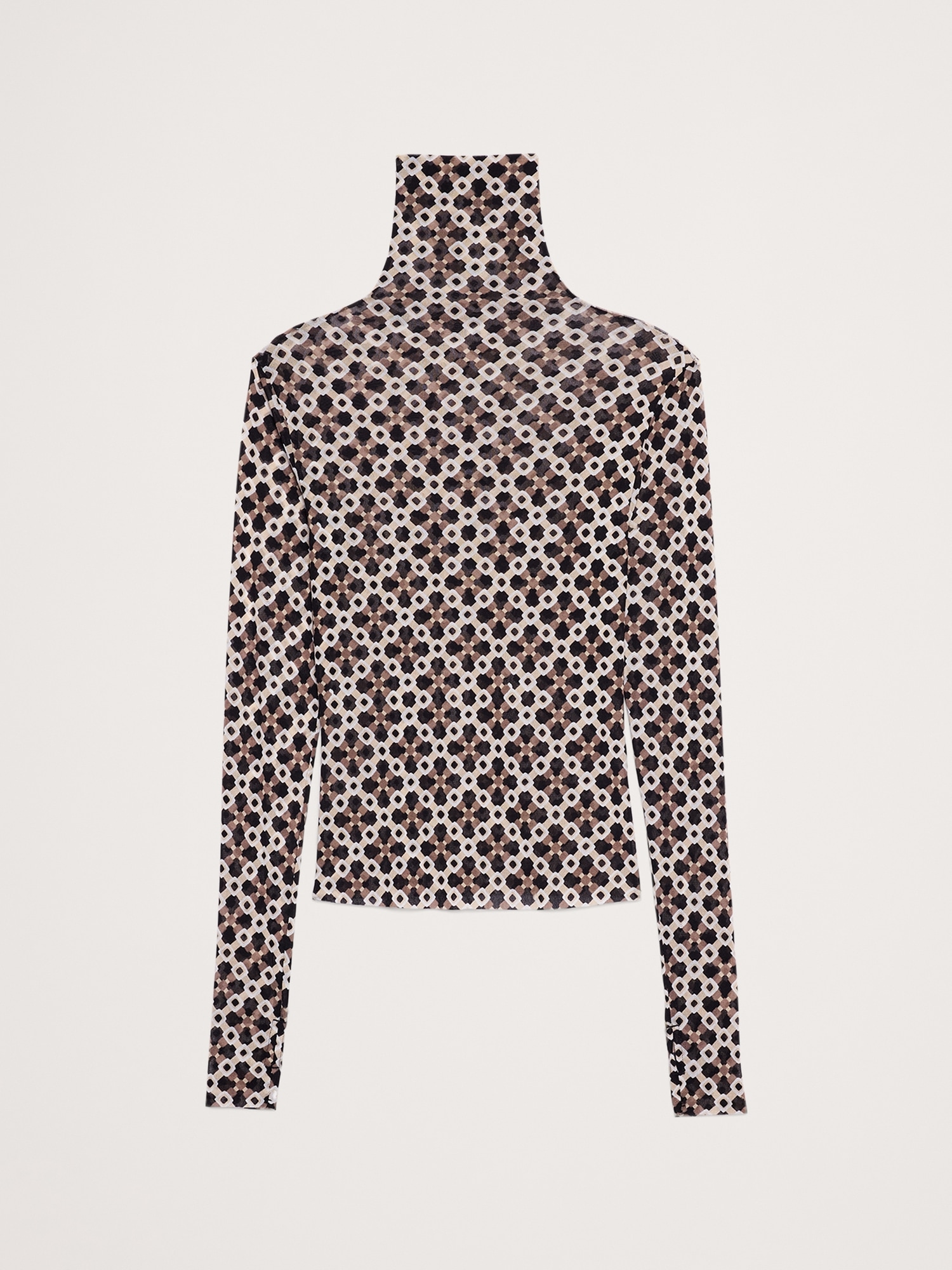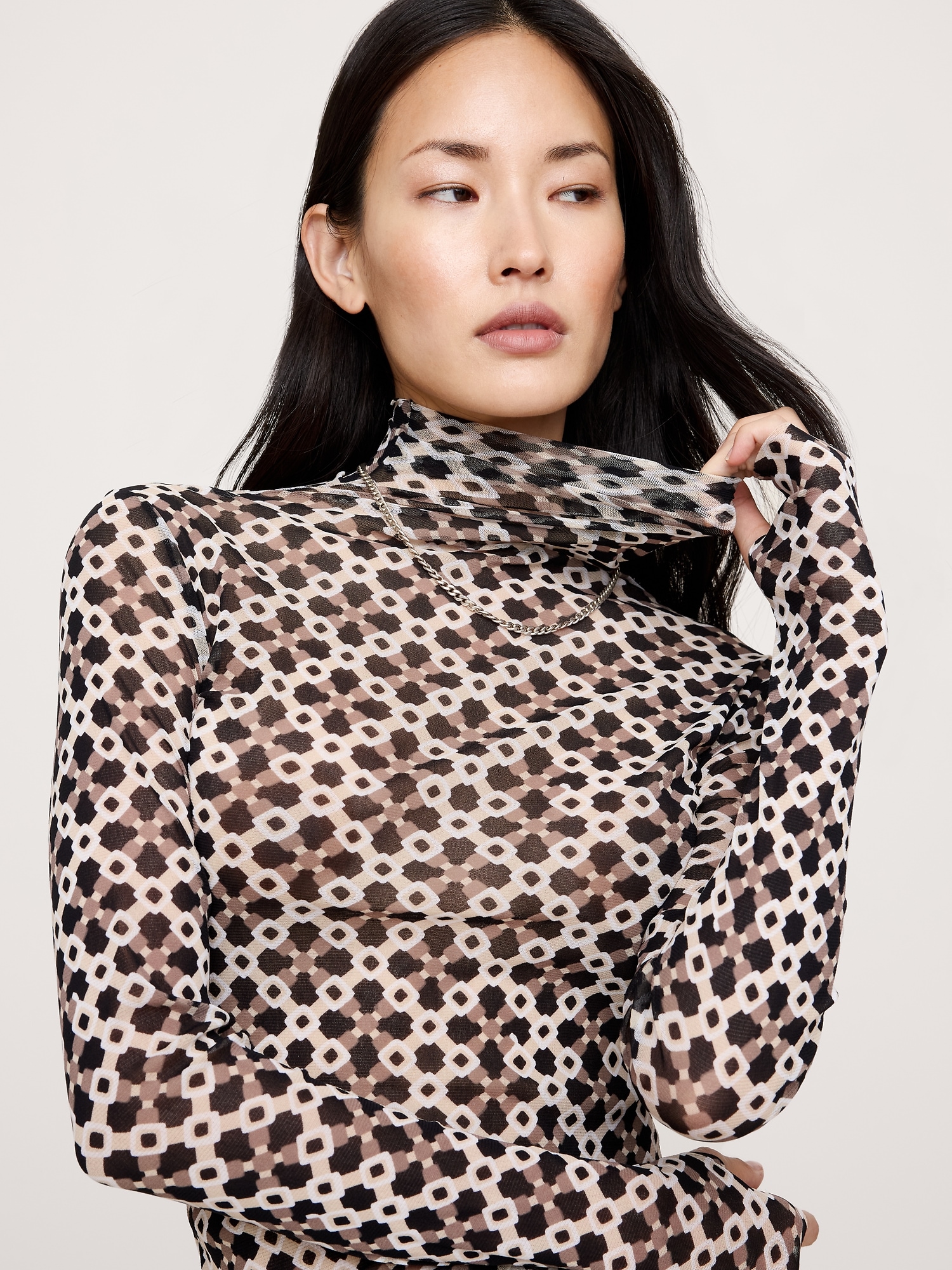 Things we love about this cute top: the semi-sheer mesh, the high neck, and the long sleeves with thumbholes. Plus, it’s super stretchy and t-shirt soft. Fitted: Slim. Sits close to the body. Turtleneck. Straight hem. Unlined. #824459