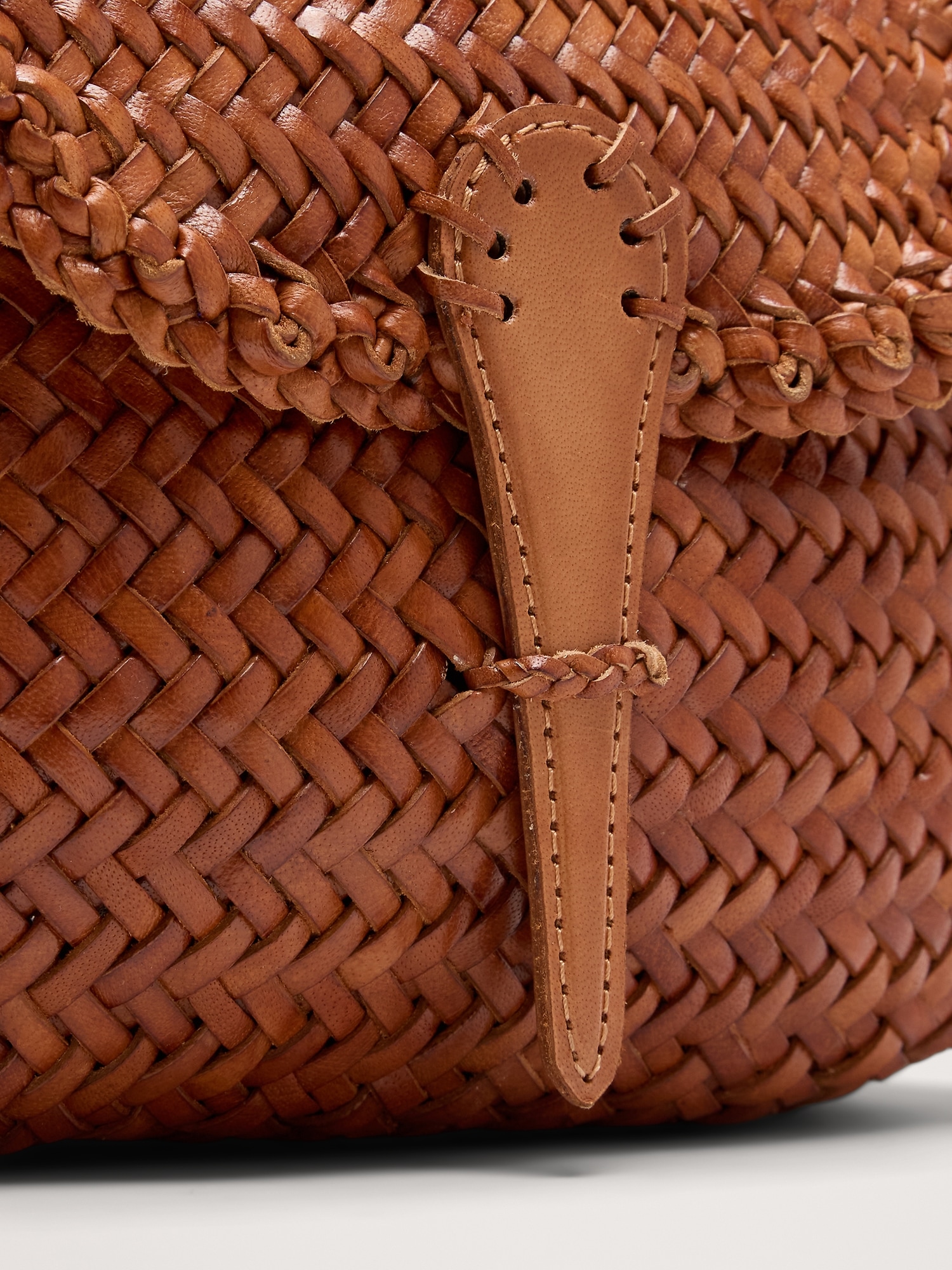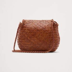 The Mini City Bag features a thin crossbody strap and delicately woven leather, with a slender leather strap closure to keep things secure.