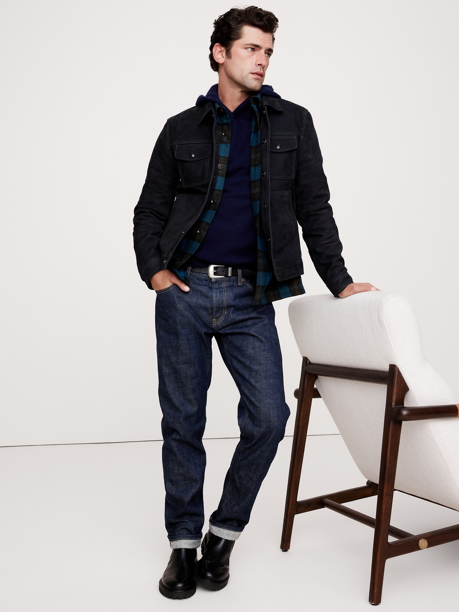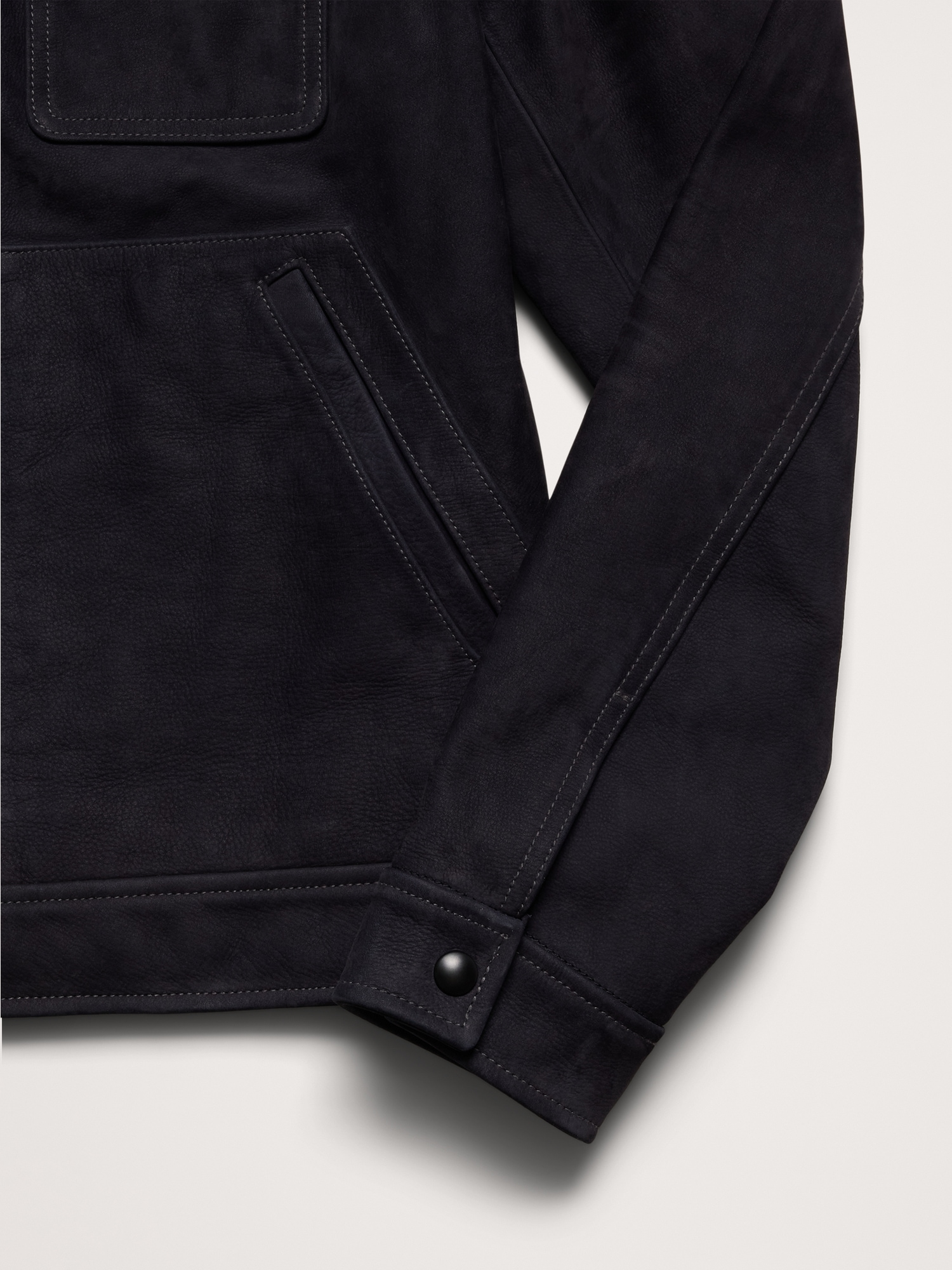 A luxurious twist on a utilitarian staple, this leather jacket borrows its silhouette from classic trucker jean jackets. We kept the pocketing, snap buttons, and top-stitch detailing of the original, and rendered it in premium nubuck leather, made in one of the world’s most renowned ateliers. Plus, since it’s nubuck, it will only get better with time, developing a rich and unique patina.