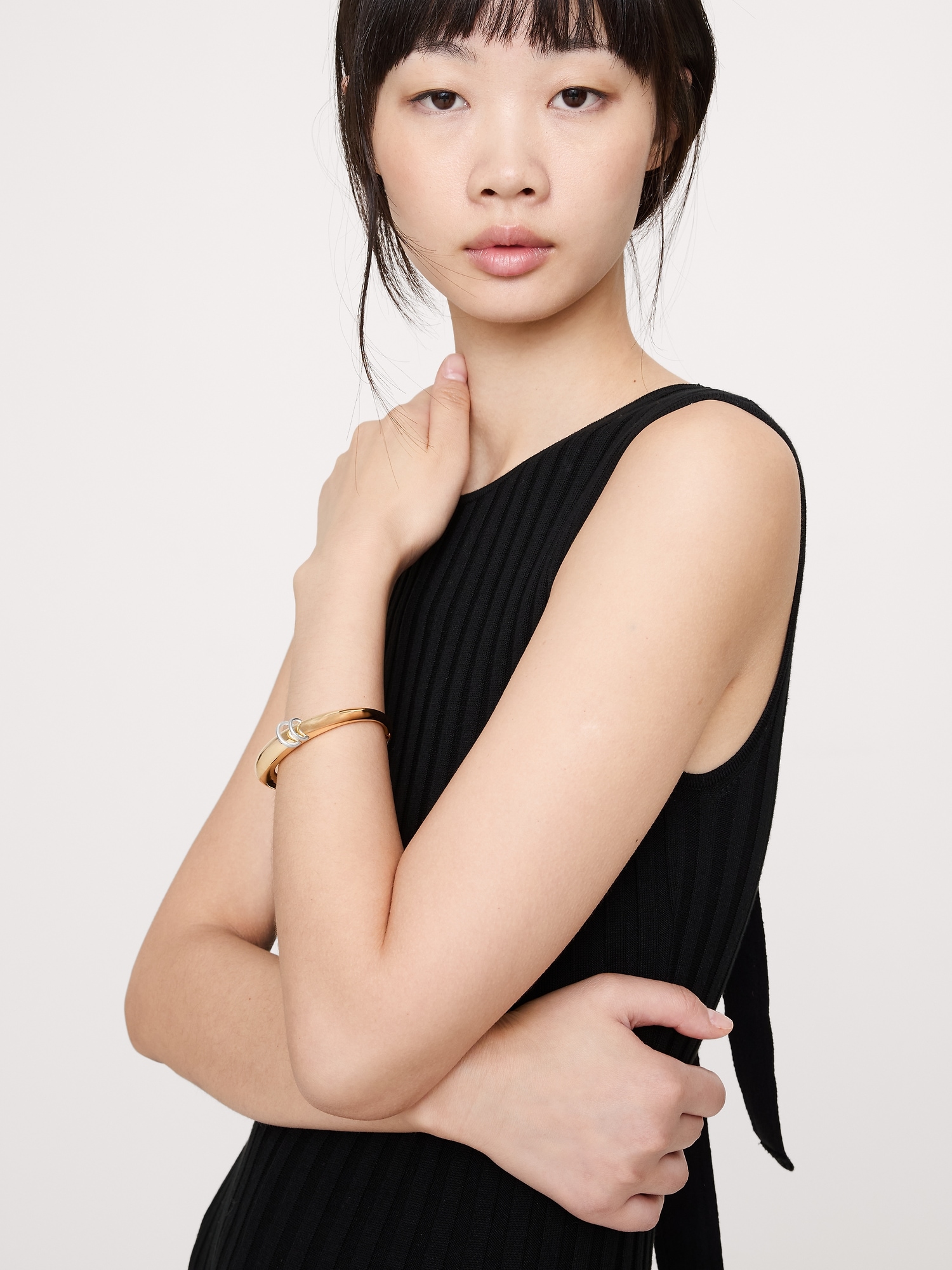 A graduated cuff bracelet accented with pierced ring details and finished with a slider clasp for a secure fit.