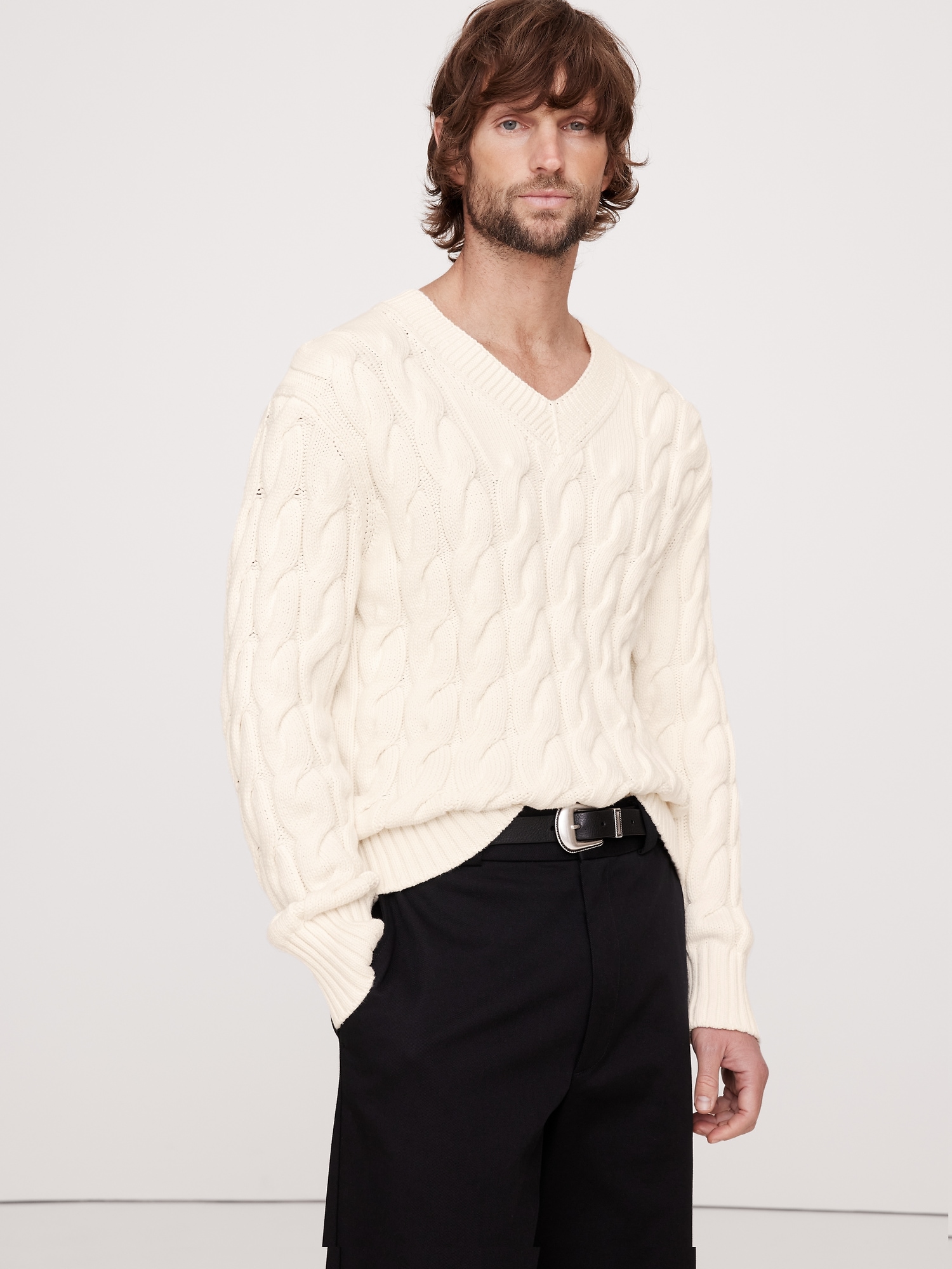 We wanted this sweater to feel like the best vintage V-necks so we kept the fit relaxed and opted for a dimensional cable-knit pattern. Since it’s made from a cotton blend, it’ll keep you warm—and well-dressed—for seasons to come.