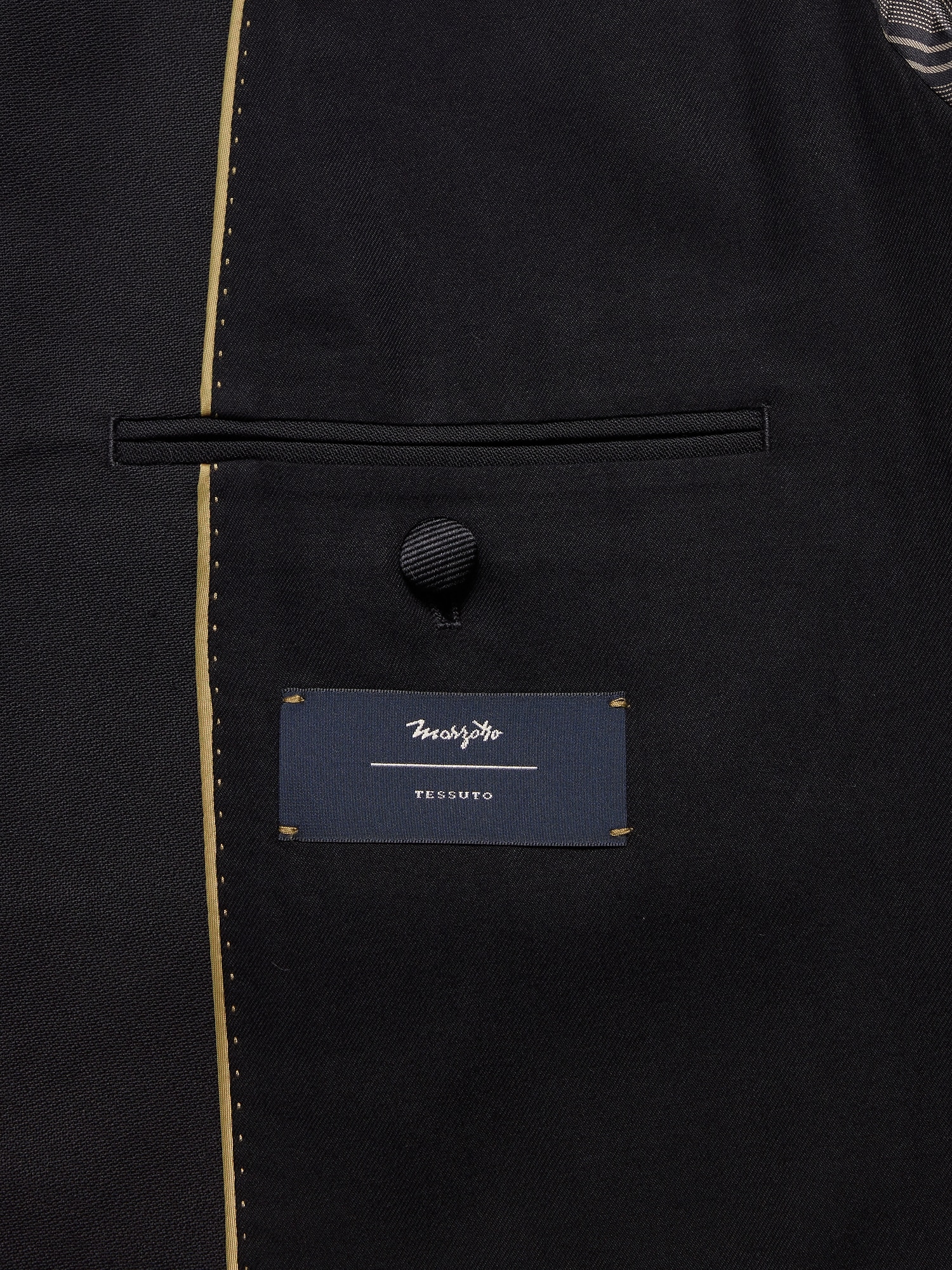 A tuxedo as special as the occasions it’ll see. Note: the Italian wool barathea fabric, the shawl lapel, and the double-breasted front (so it formal).