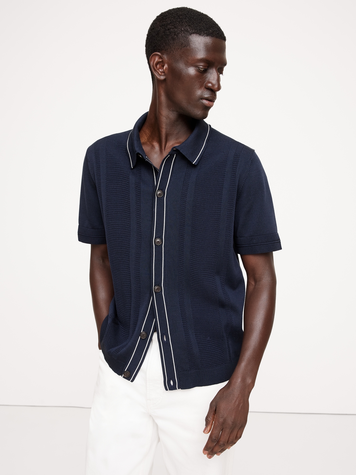 Resort shirt meets sweater polo. We combined the best of both using a variety of ribbed stitches in our 100% certified-organic yarn (so it’s ultra soft).
