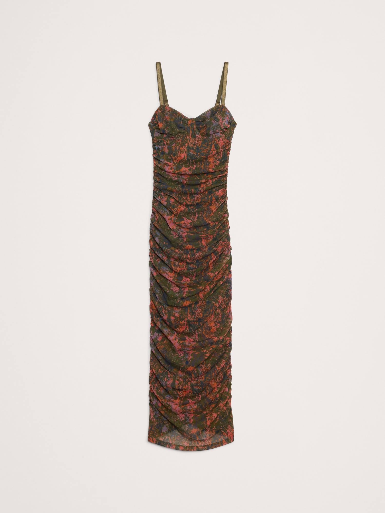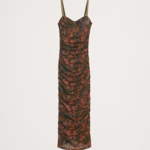 Hard to forget. This slinky midi dress has a corset-inspired bodice and allover ruching, cut in our stretch-mesh for a delightful, next-to-skin feel.