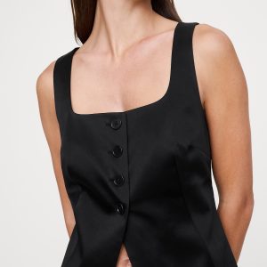 We cut this square-neck vest in a longer length with a square neckline, in a soft satin fabric. Make it a set with the matching kick-flare pant.