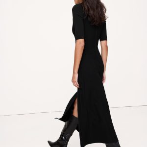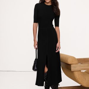 A dress that says \”leave it to me\”. We cut this midi dress in our high-stretch Sculpted yarn, here with a Milano stitch so it lays smooth against the skin.