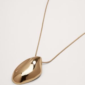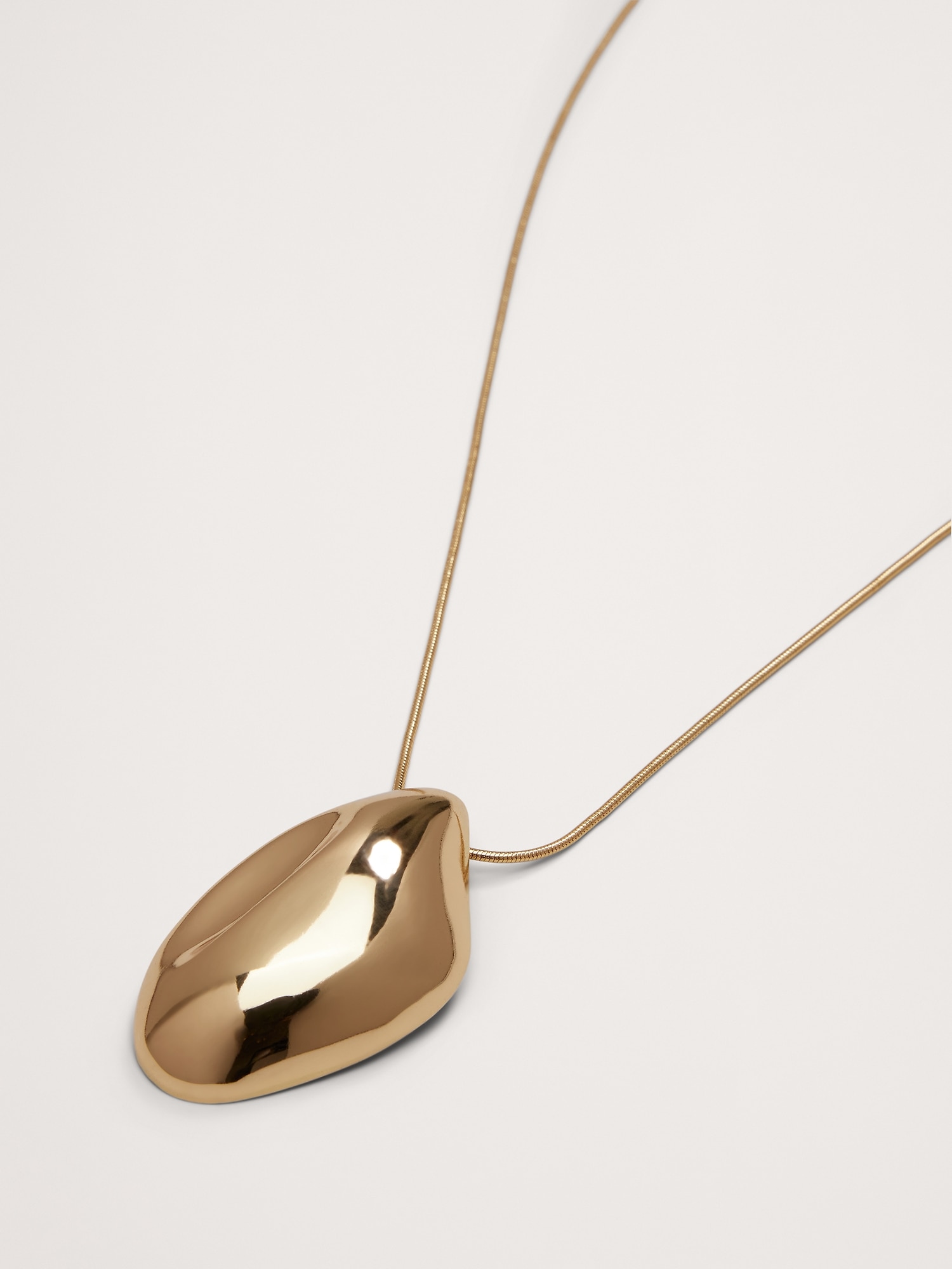 A sculptural contoured pendant is cast in brass parts and brazed together. The hollow gold finished or silver-plated pendant is paired with an adjustable length snake chain.