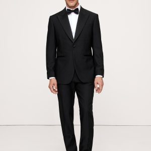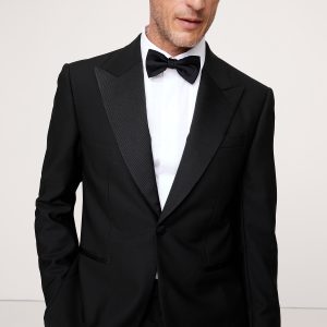 A tuxedo as special as the occasions it’ll see. Note: the Italian wool barathea fabric, the silk faille lapel and covered buttons, and the sharp, roped shoulder construction (so it formal).