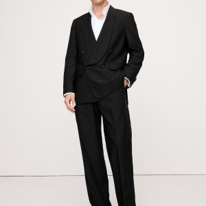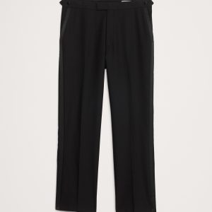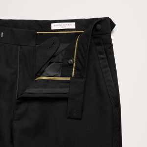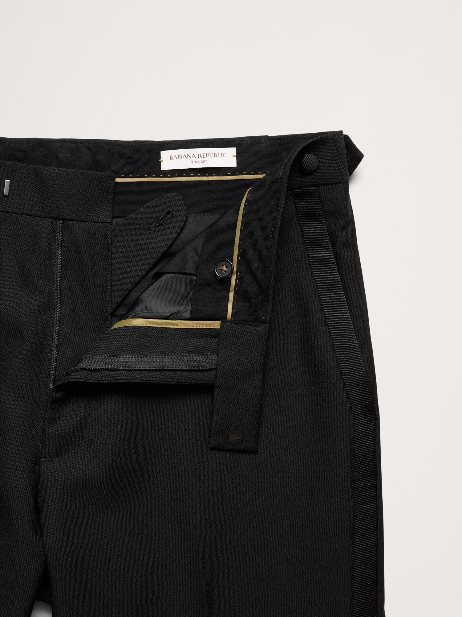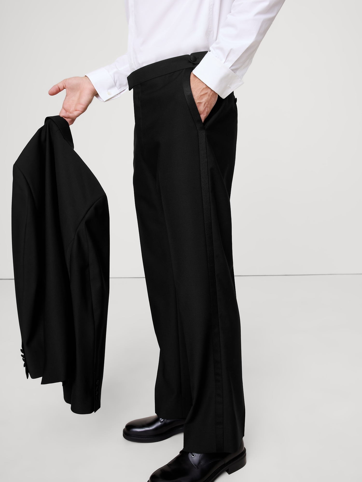 A tuxedo as special as the occasions it’ll see. Note: the Italian wool barathea fabric, the silk faille tuxedo stripe at the sides, and the crisp trouser crease (so they formal). Here, in a straight-leg silhouette.