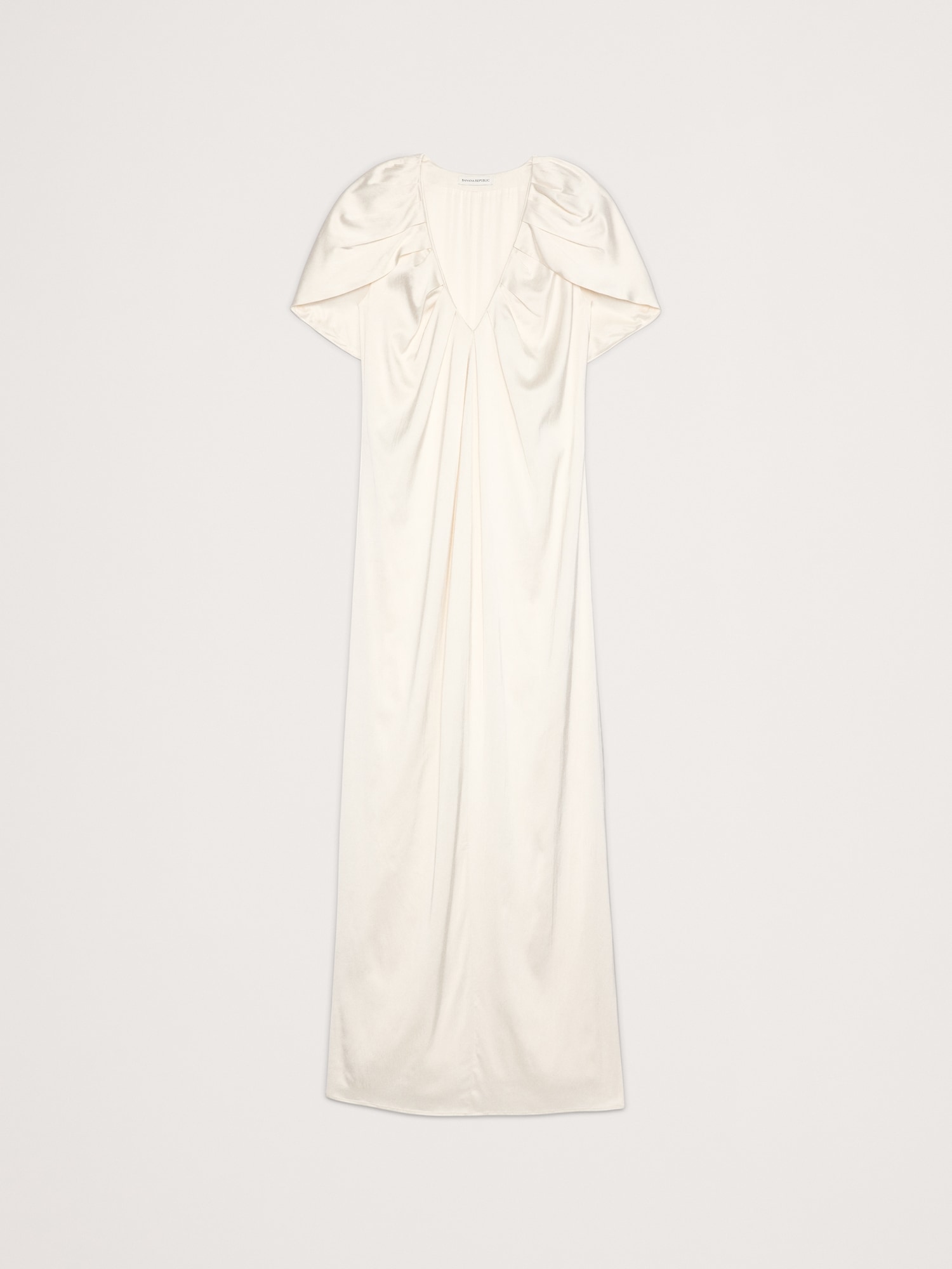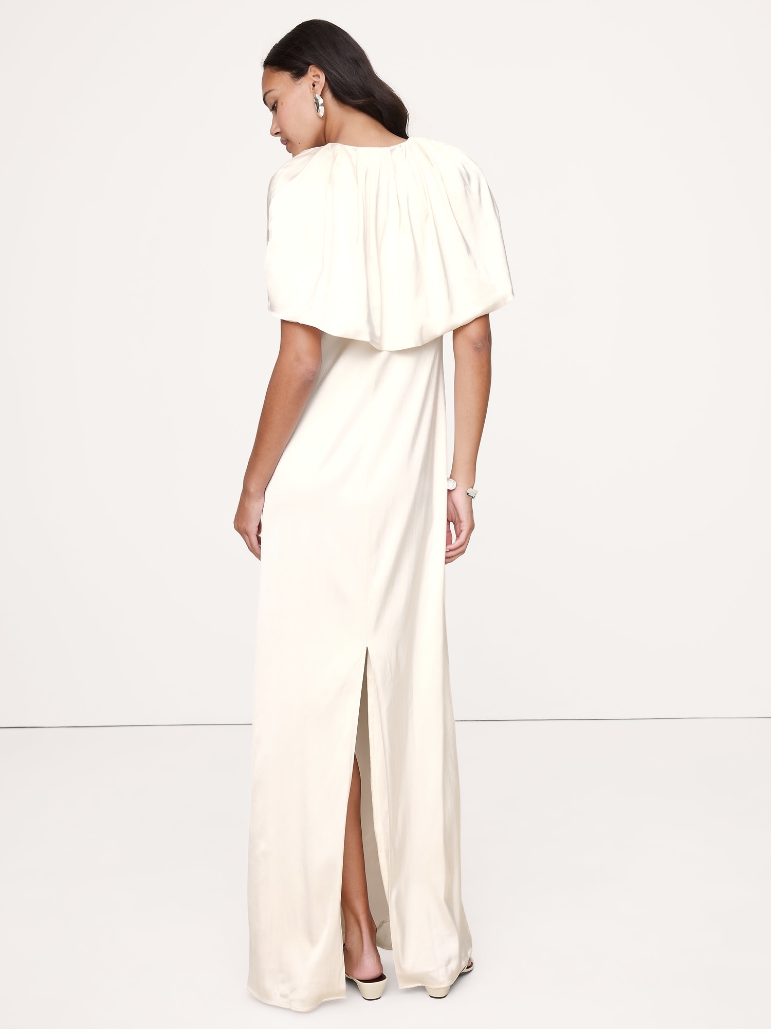 Make an entrance in this maxi dress. There’s a lot to love: the stretch satin fabric, the cape-sleeve detail, and the statuesque, column silhouette.