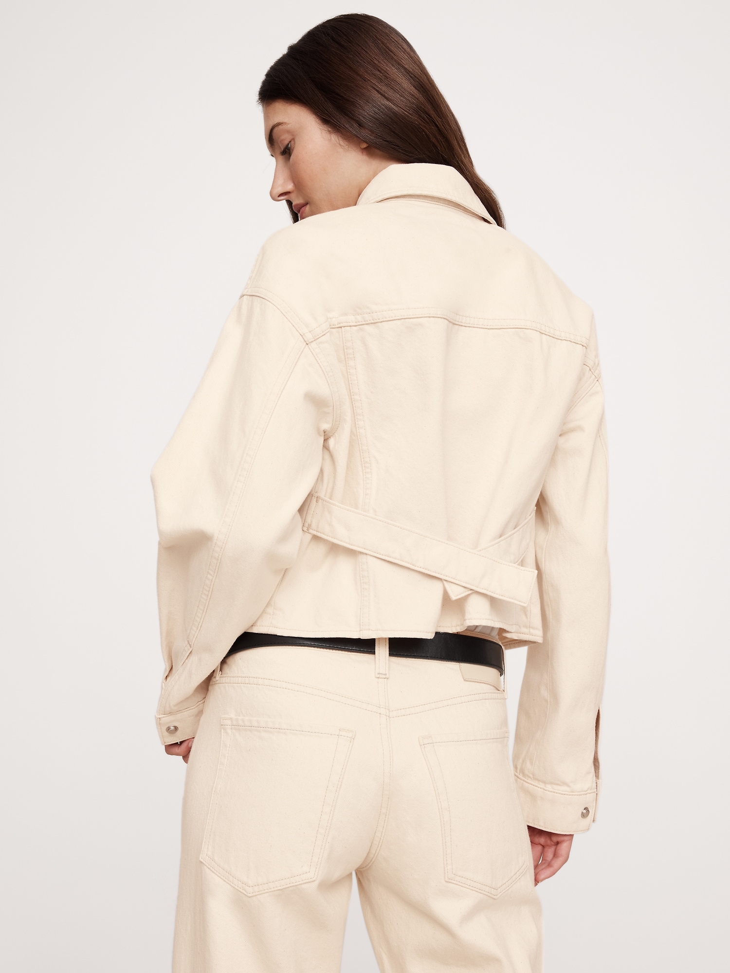 An invitation to play with proportions, this jacket borrows its silhouette from vintage trucker jackets. Our design team updated it with a belt at the back to cinch in the waist—looks great with high-rise jeans.